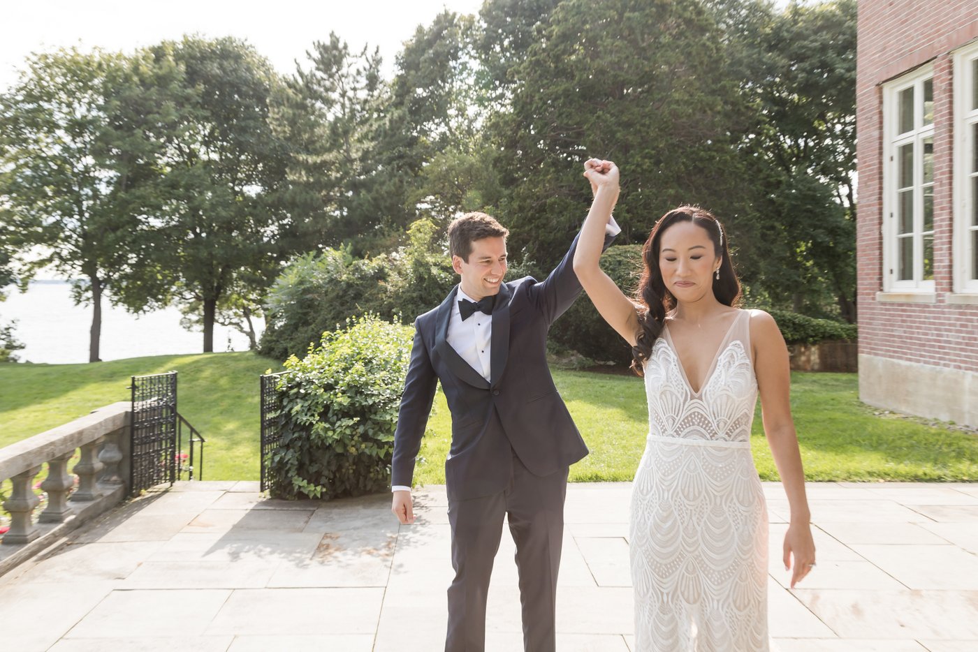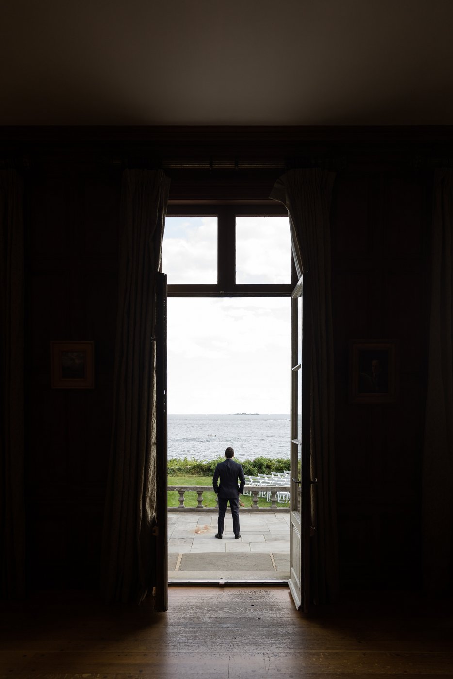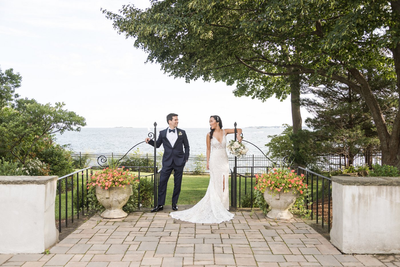 We began the day with getting ready moments, then moved into an emotional first look on the terrace. The couple shared a quiet moment together before we explored the estate grounds for portraits. Some of those were taken on the elegant furniture inside the mansion, others outside with the ocean and lush greenery as a backdrop.