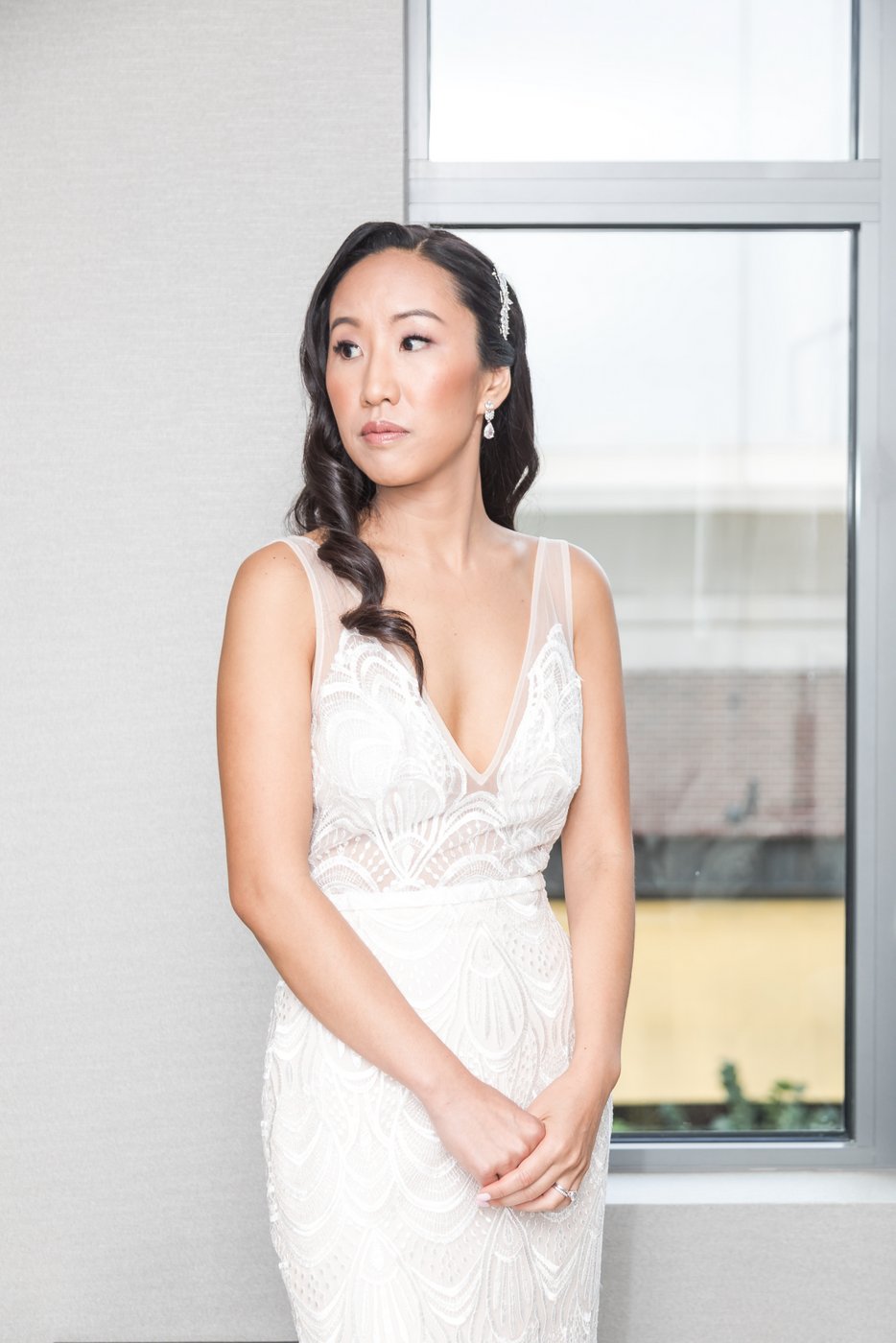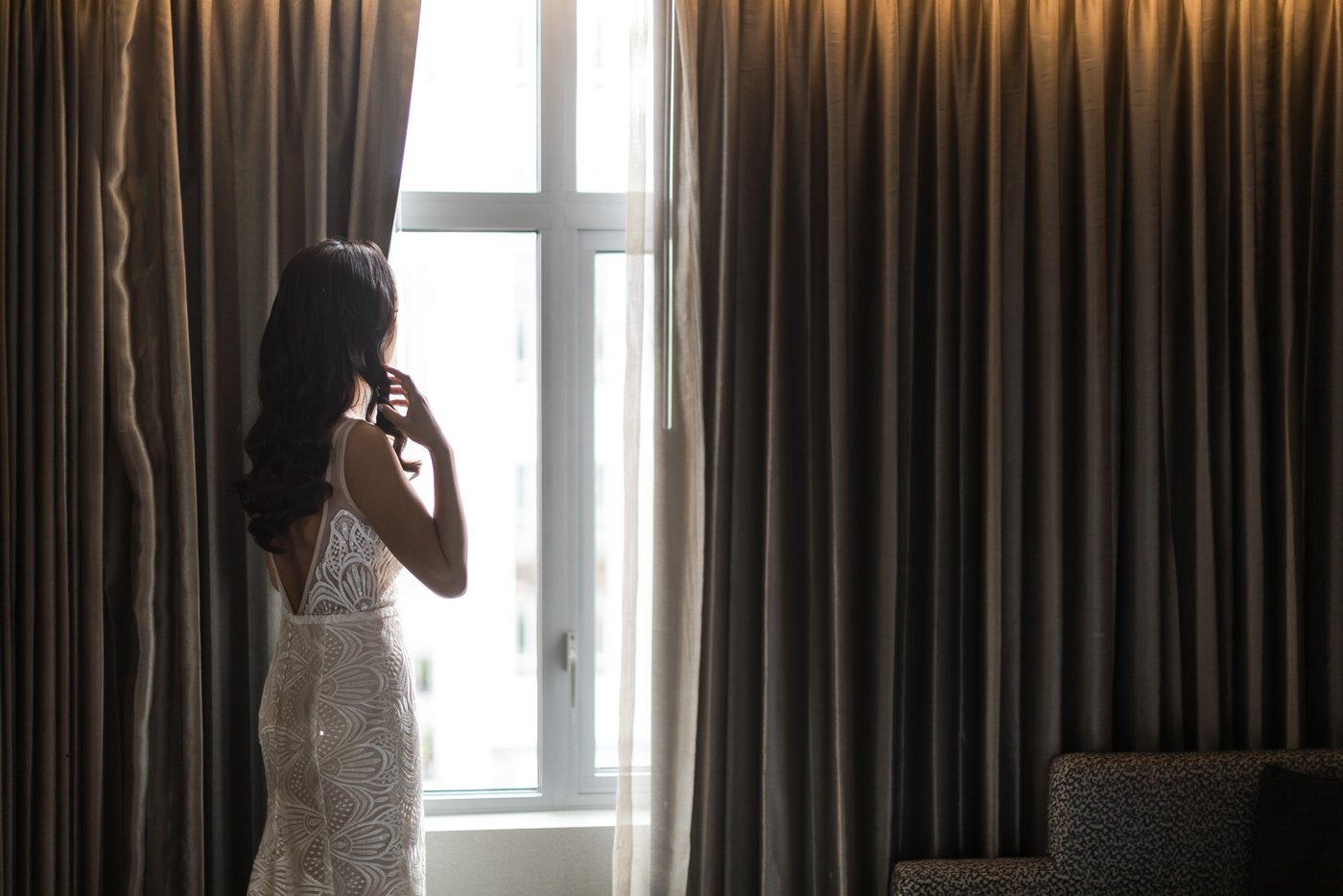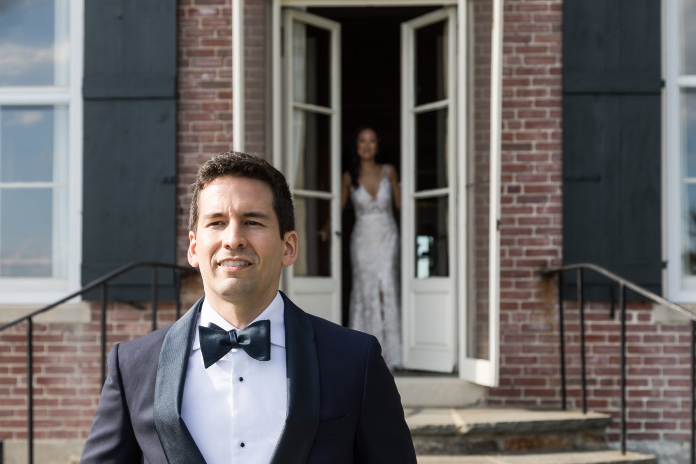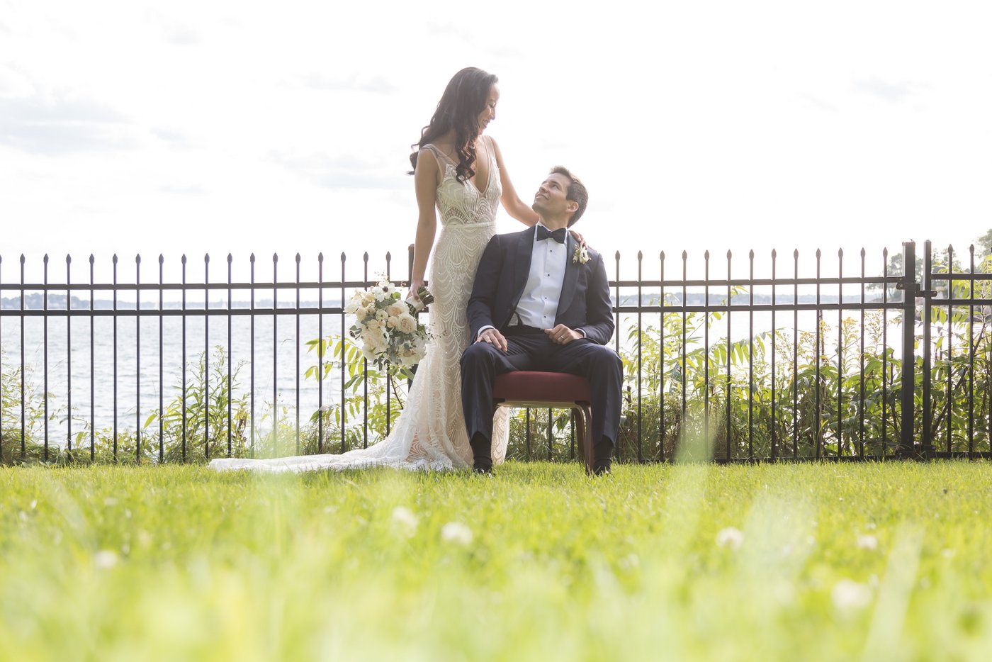 We began the day with getting ready moments, then moved into an emotional first look on the terrace. The couple shared a quiet moment together before we explored the estate grounds for portraits. Some of those were taken on the elegant furniture inside the mansion, others outside with the ocean and lush greenery as a backdrop.