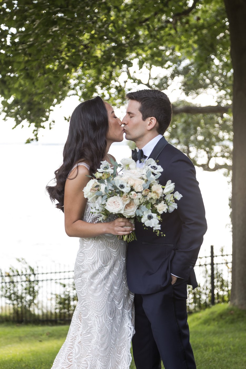 Framed by trees, with the setting sun casting a magical glow on the lawn, the bride and groom kiss near the wedding reception tent at Misselwood Estate.