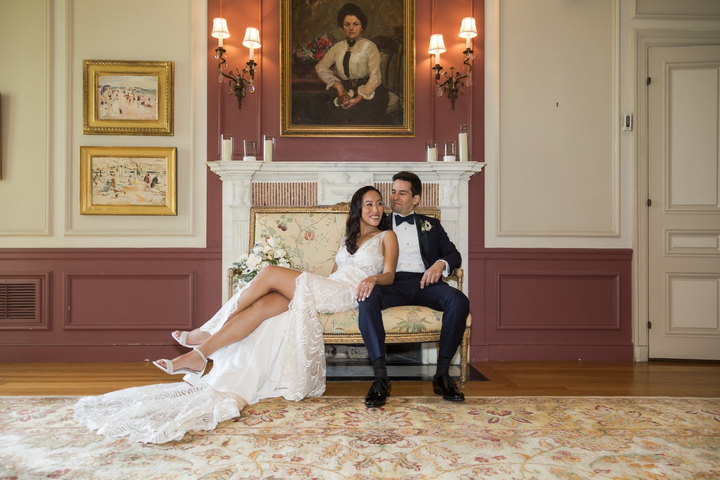 Wedding portrait of bride and groom on vintage couch inside Misselwood Estate mansion in Beverly MA