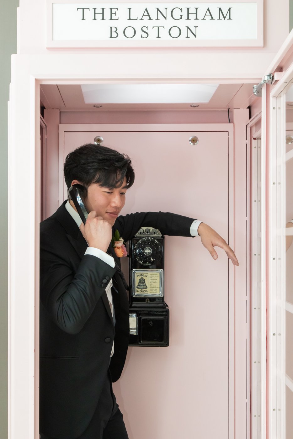 Their morning began at the Langham Boston, one of the city’s most timeless getting-ready locations. Kerry and her bridesmaids prepped in a light-filled suite, while Perry and his groomsmen shared laughs (and a few celebratory drinks) nearby. We also explored the Langham’s iconic hallways for portraits—including the playful pink phone booth.