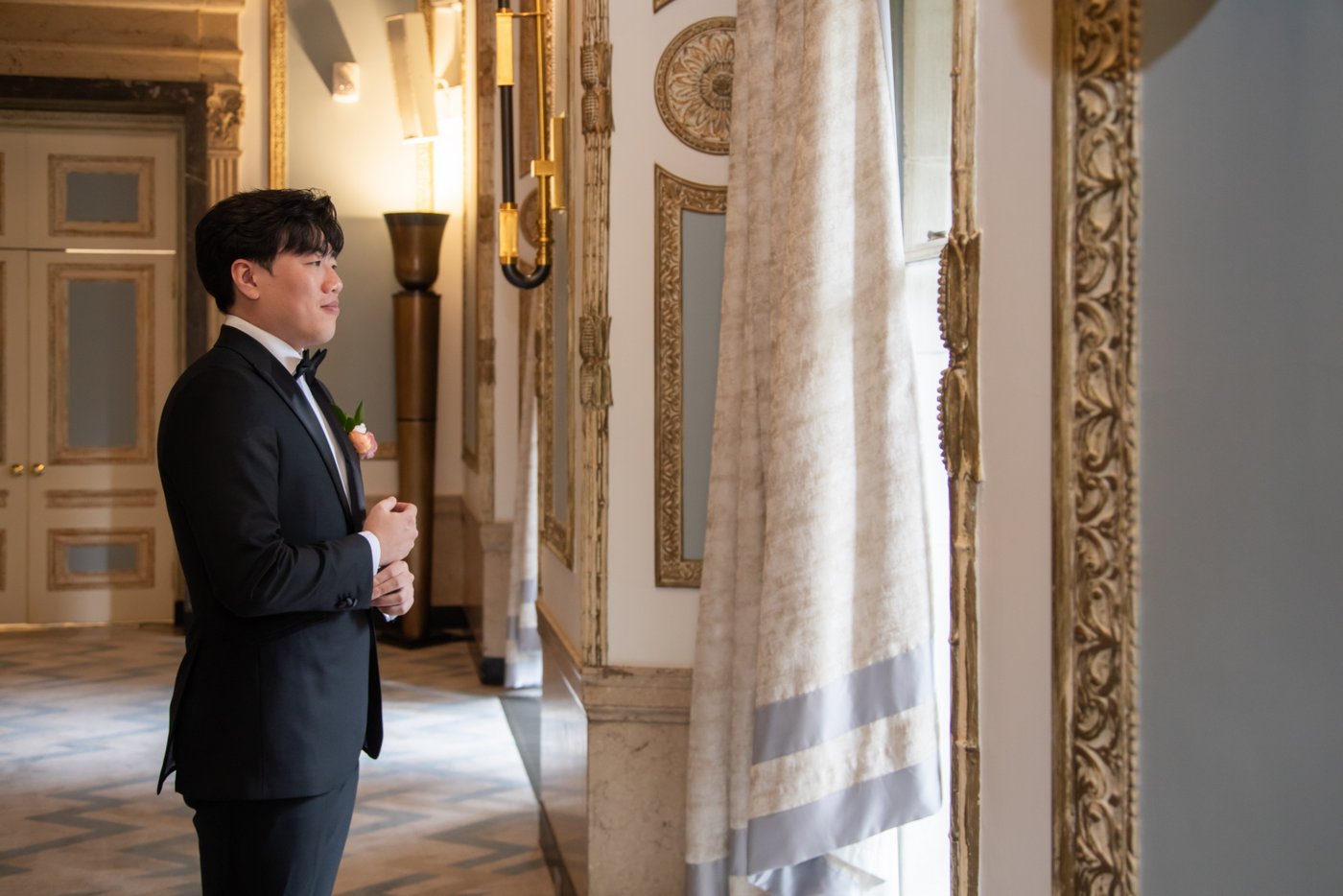 Elegant getting ready moments and a romantic first look at the Langham Hotel Boston, photographed by Spagnolo Photography. Kerry and Perry’s wedding day began in the hotel’s timeless interiors, blending classic Boston charm with modern sophistication. Candid, documentary-style wedding photography by Spagnolo Photography, Boston wedding photographers known for creative storytelling and natural portraits.