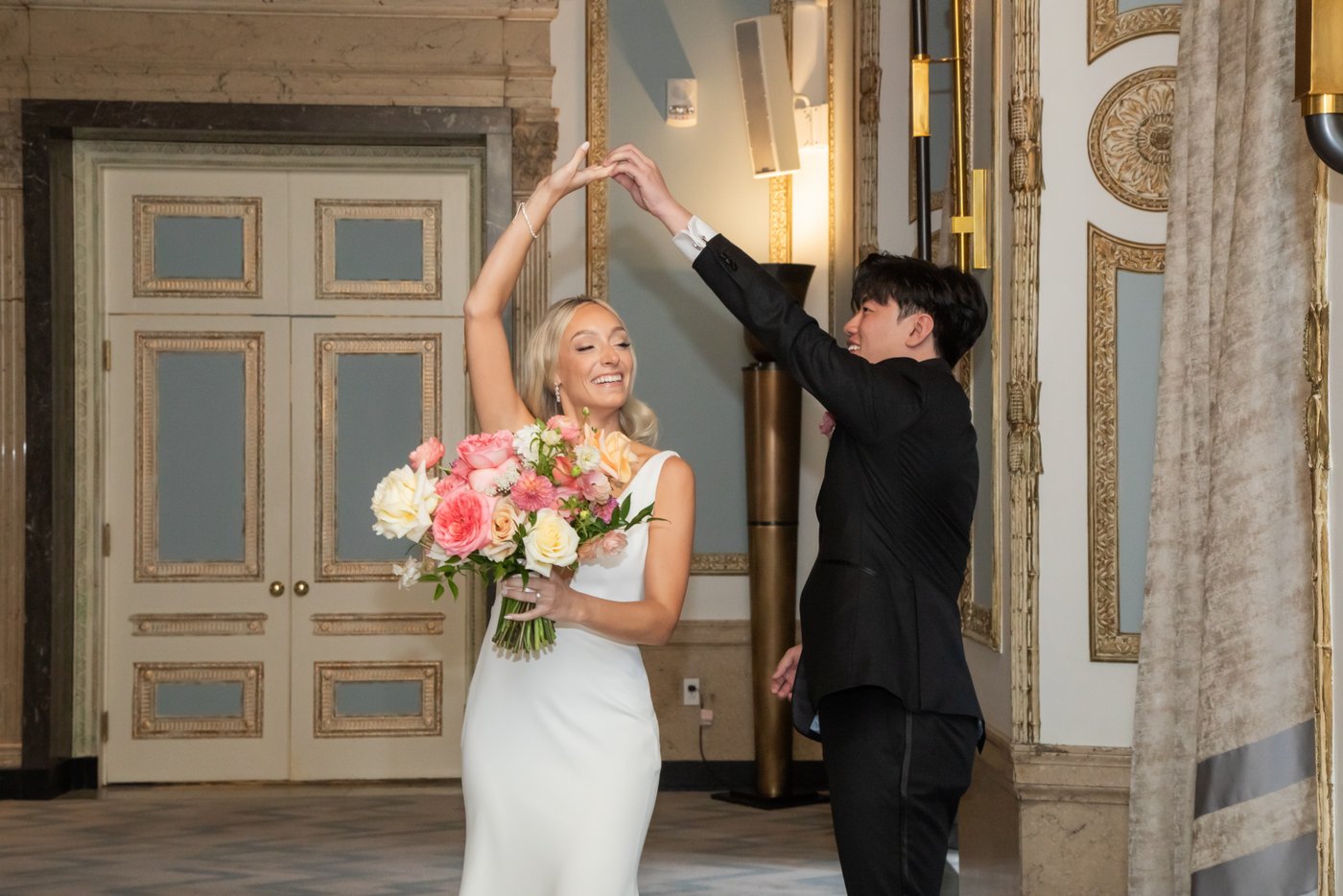 Before the main ceremony, Kerry changed into a red and gold Qun Kwa—a traditional Chinese wedding dress. The tea ceremony was held in the State Room’s Cityside Room. It was intimate, heartfelt, and truly meaningful.