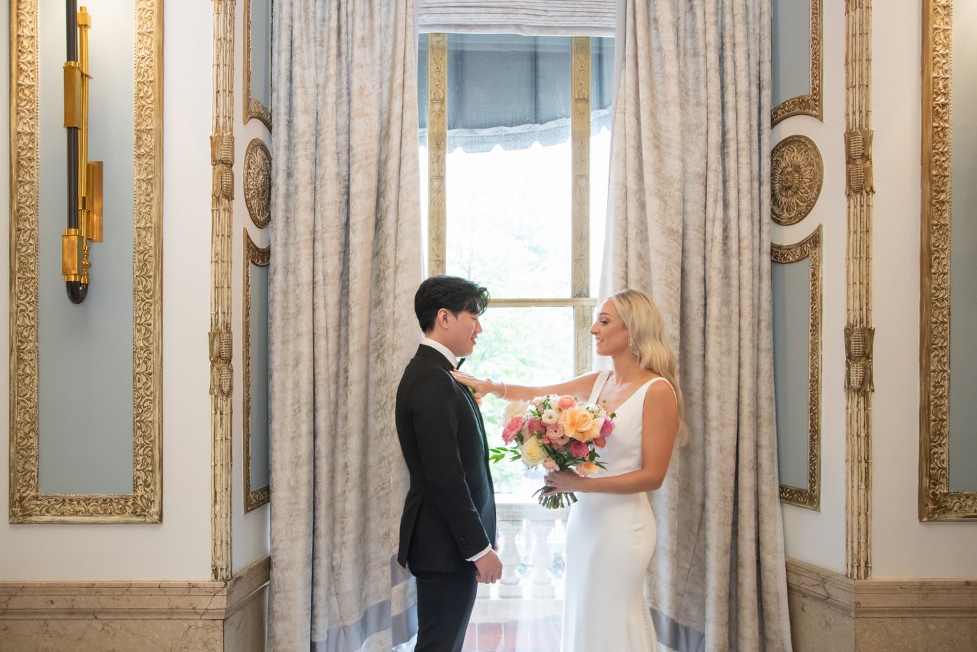 The couple’s first look took place in the Langham’s grand Wyeth Room. With its arched windows, gold-coffered ceilings, and murals, the room offered a beautiful backdrop. Afterward, we visited Christopher Columbus Park for classic bridal party photos before the formal events began.