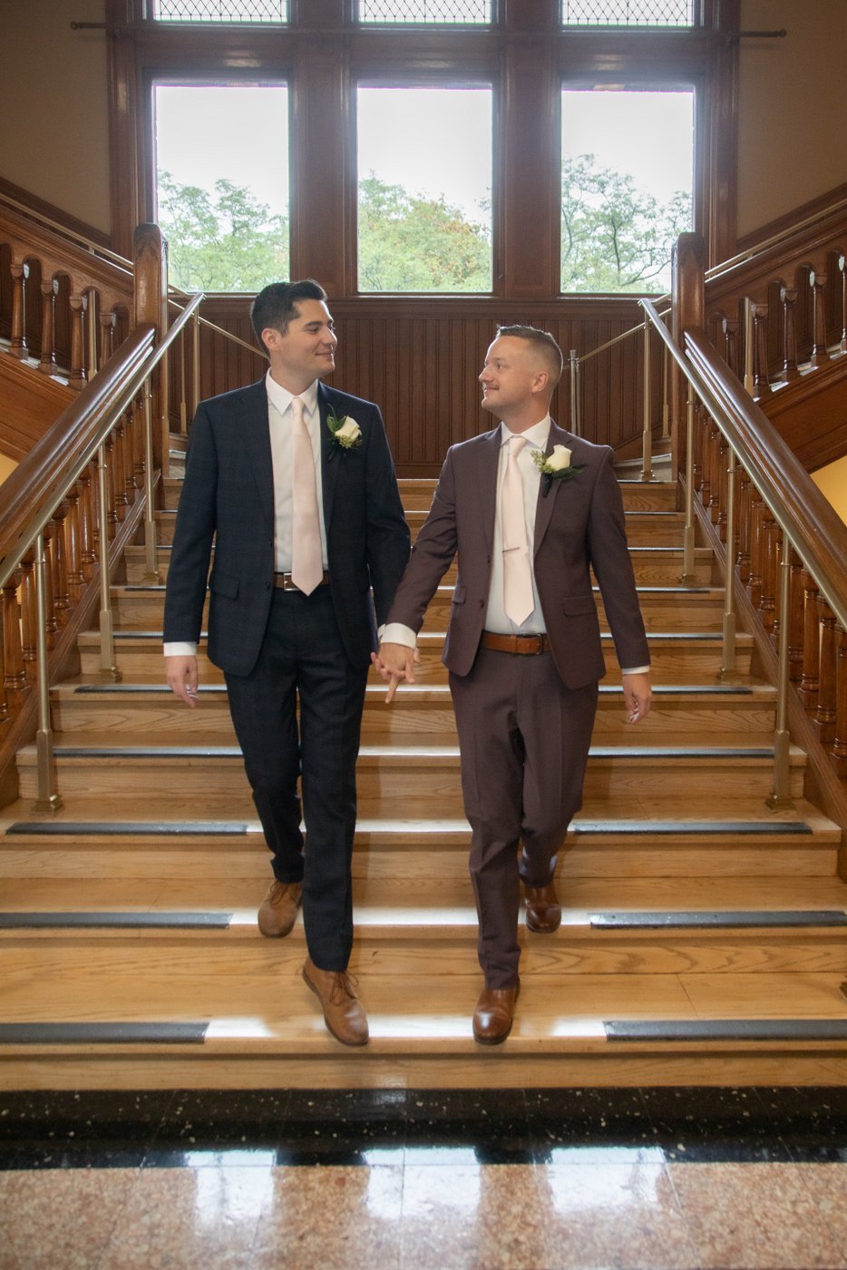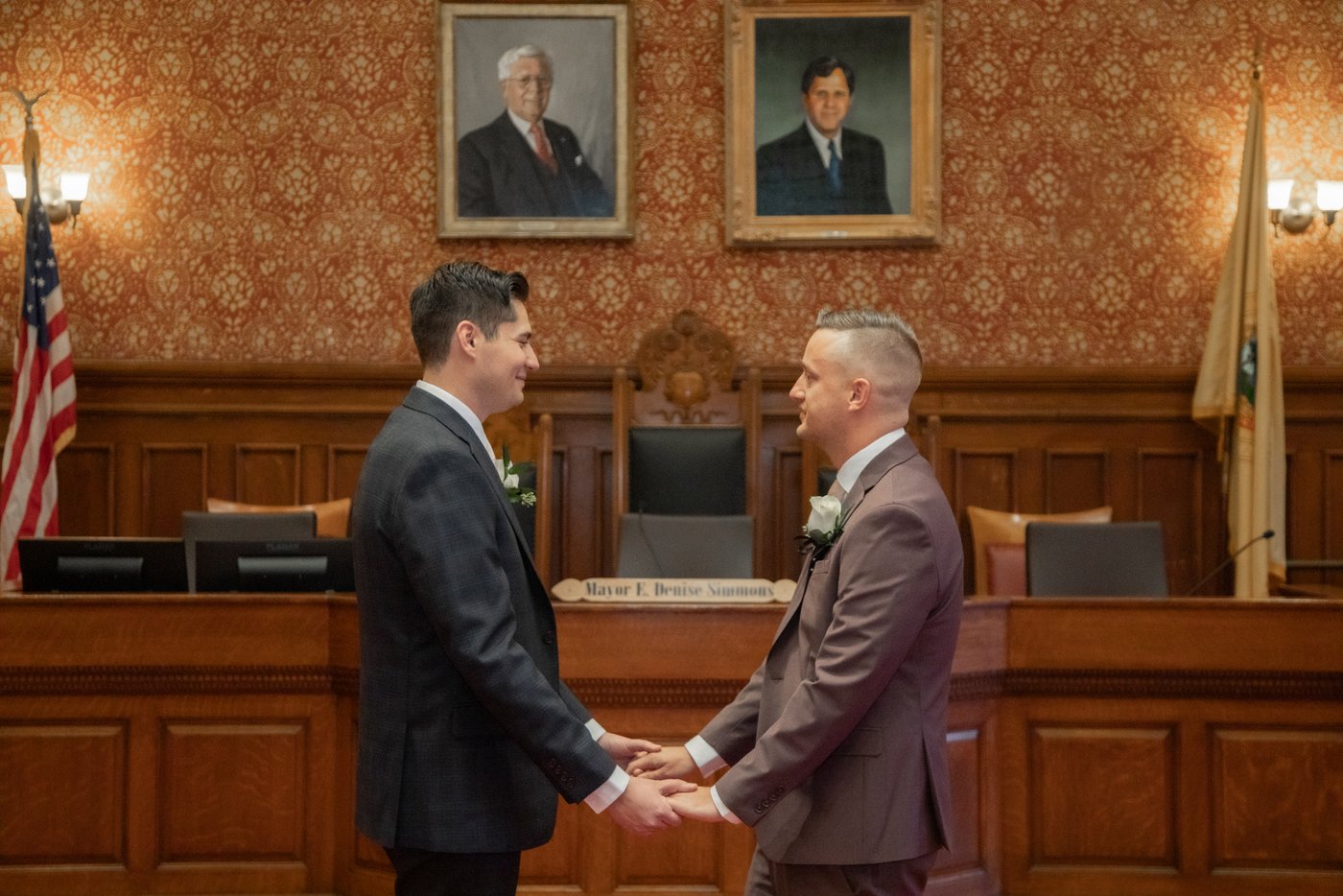 A scene from a Cambridge City Hall wedding ceremony featuring two grooms holding hands as the city clerk officiates their wedding in the Sullivan Chamber.