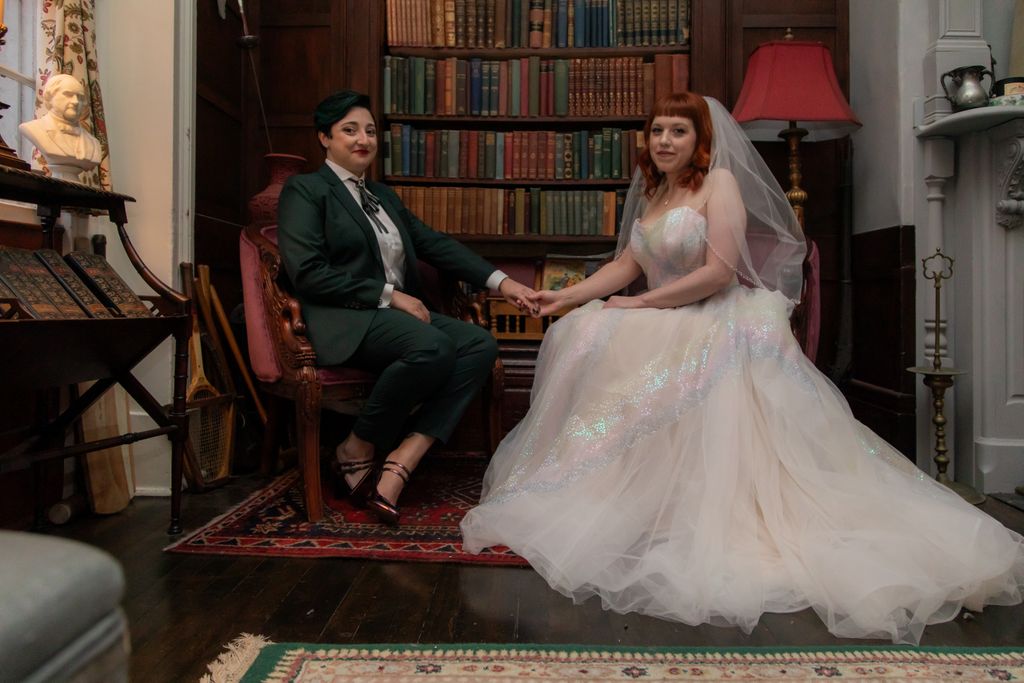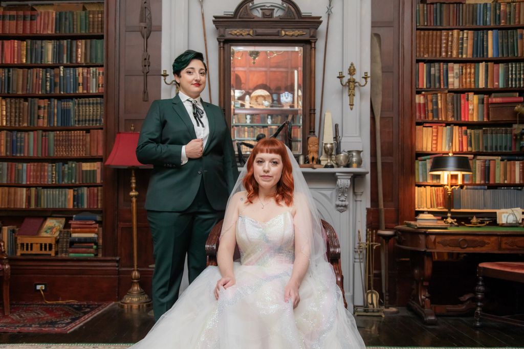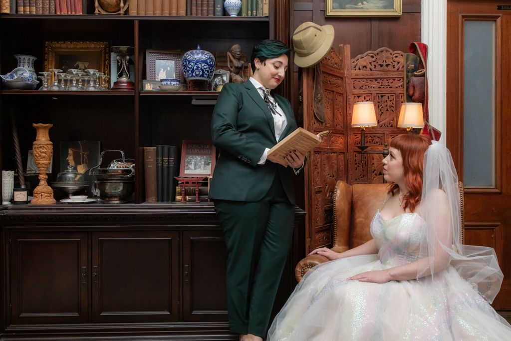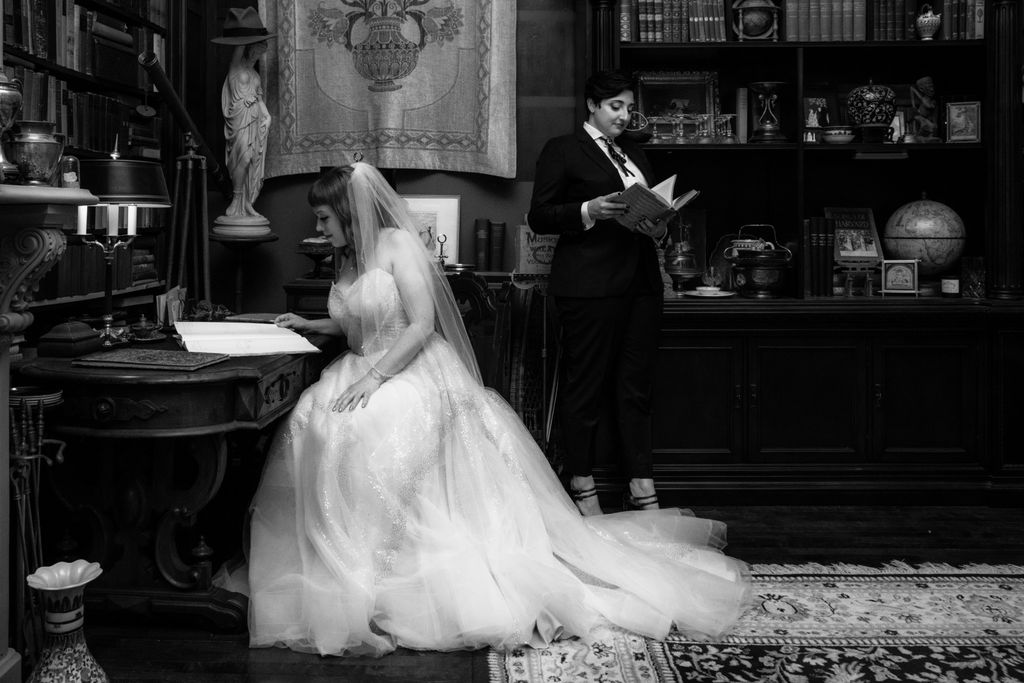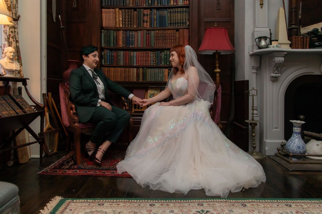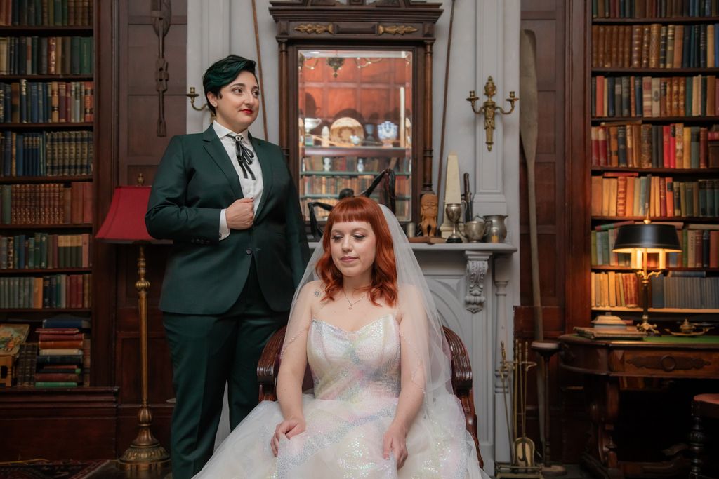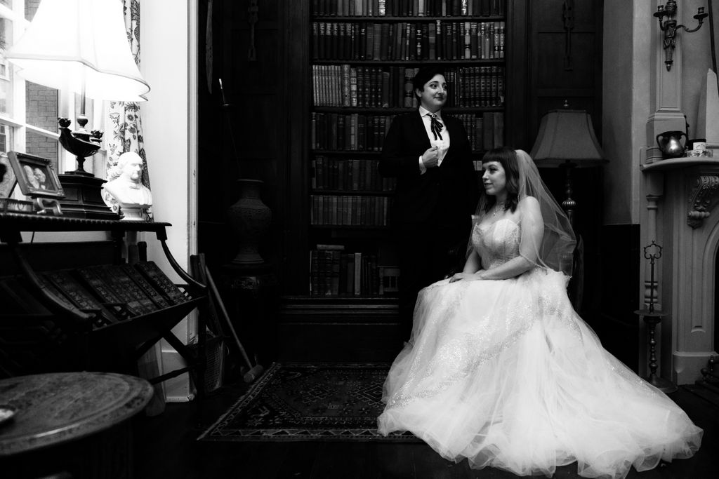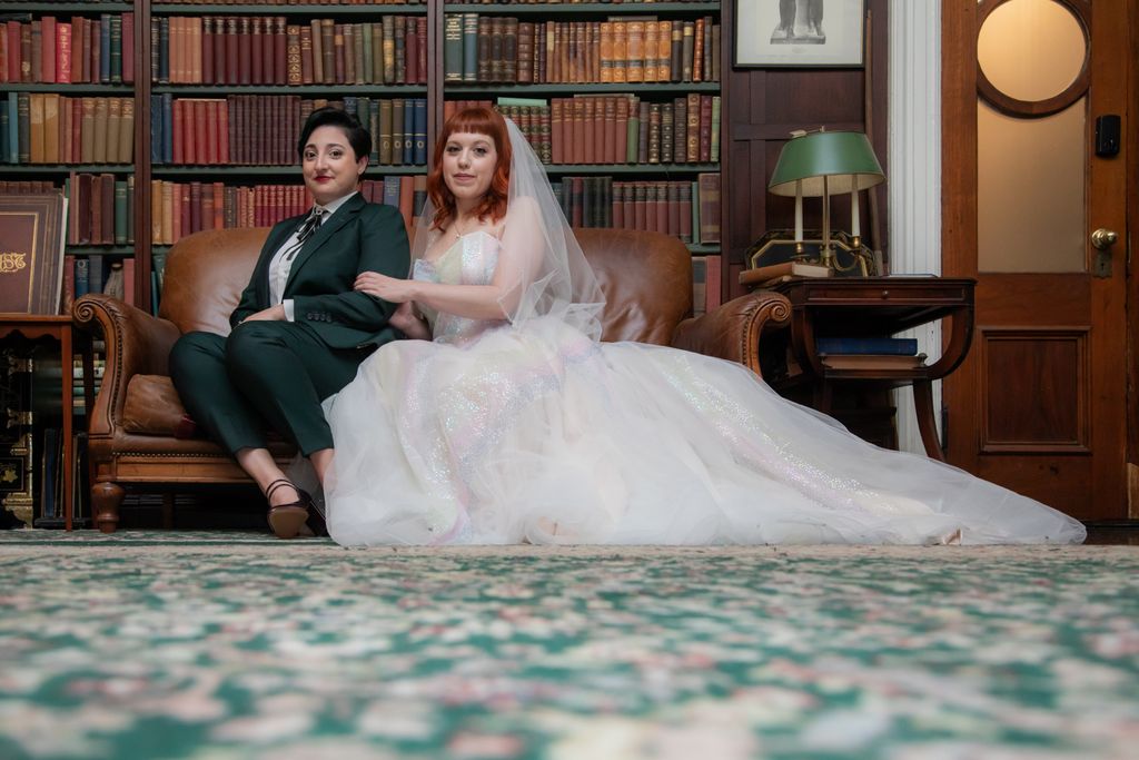 Two brides sit on a brown leather couch surrounded by books and antiques at Diehl Marcus in Salem, MA, before their LGBTQ wedding at The Ledger restaurant, photographed by artistic LGBTQ-friendly wedding photographers Spagnolo Photography.