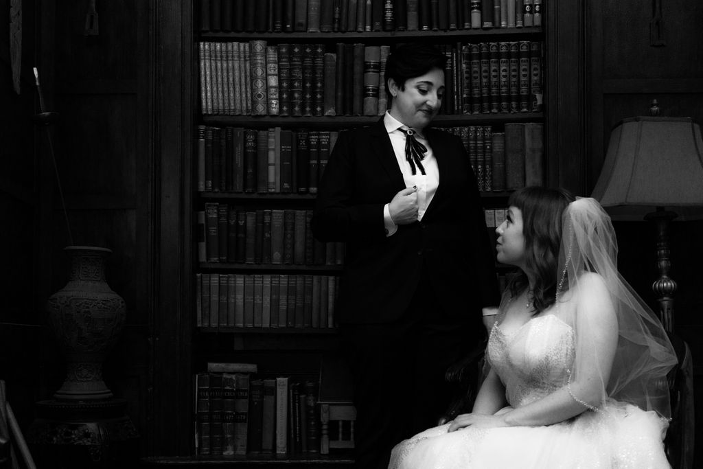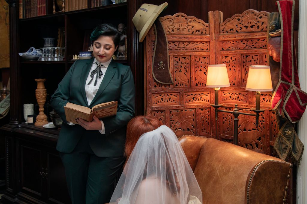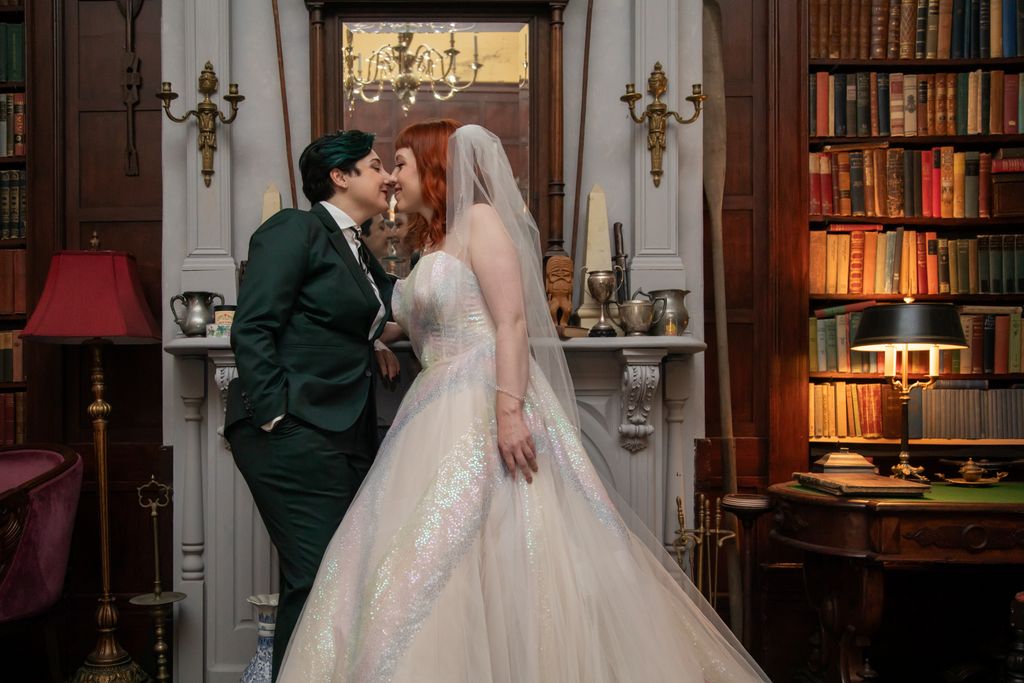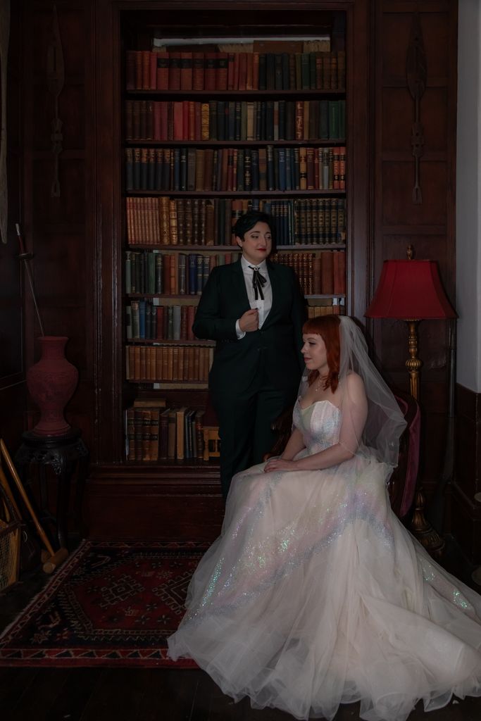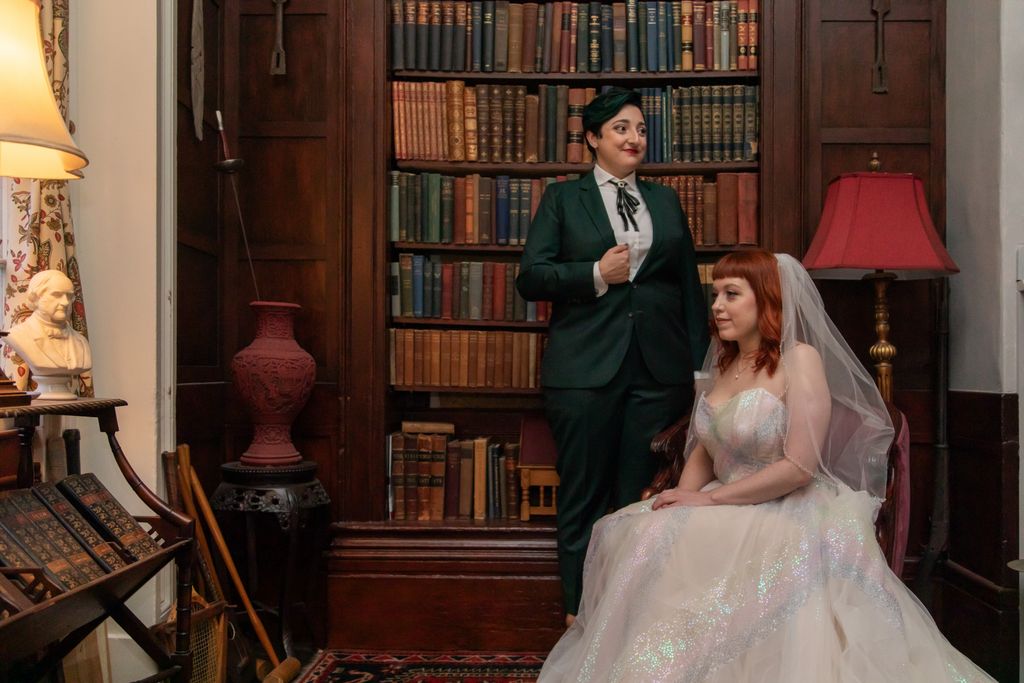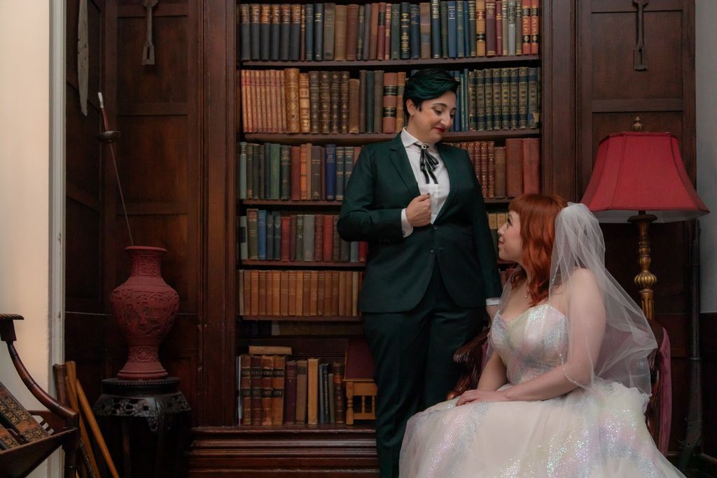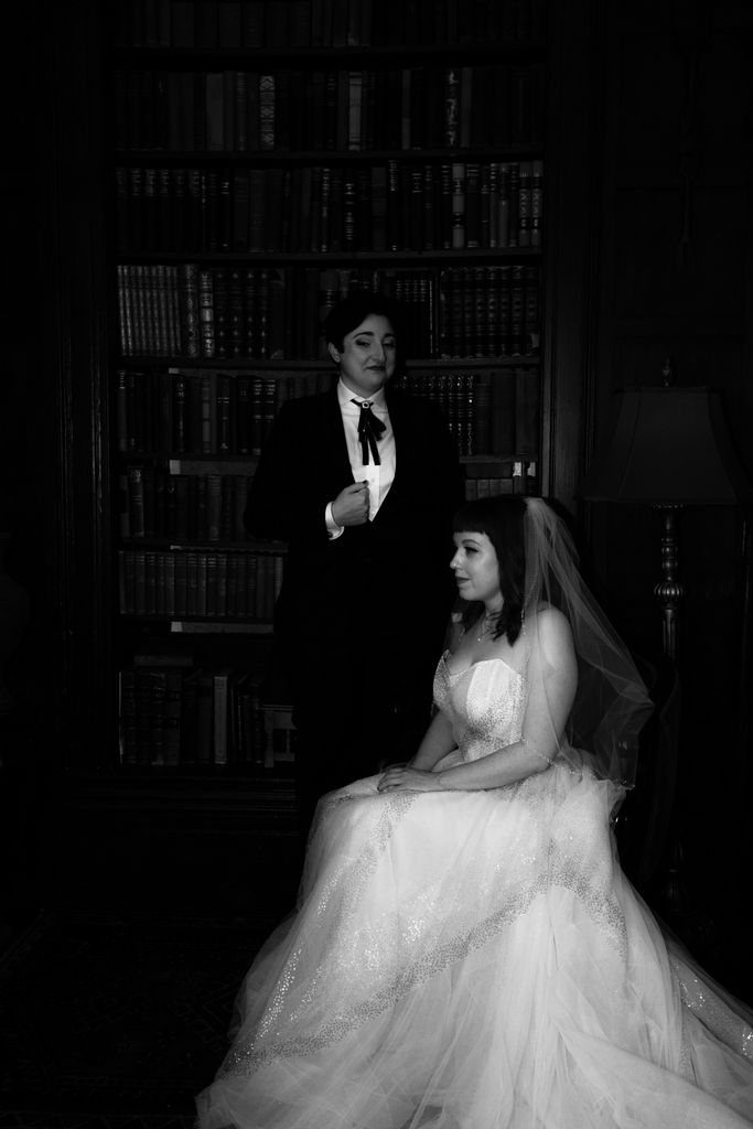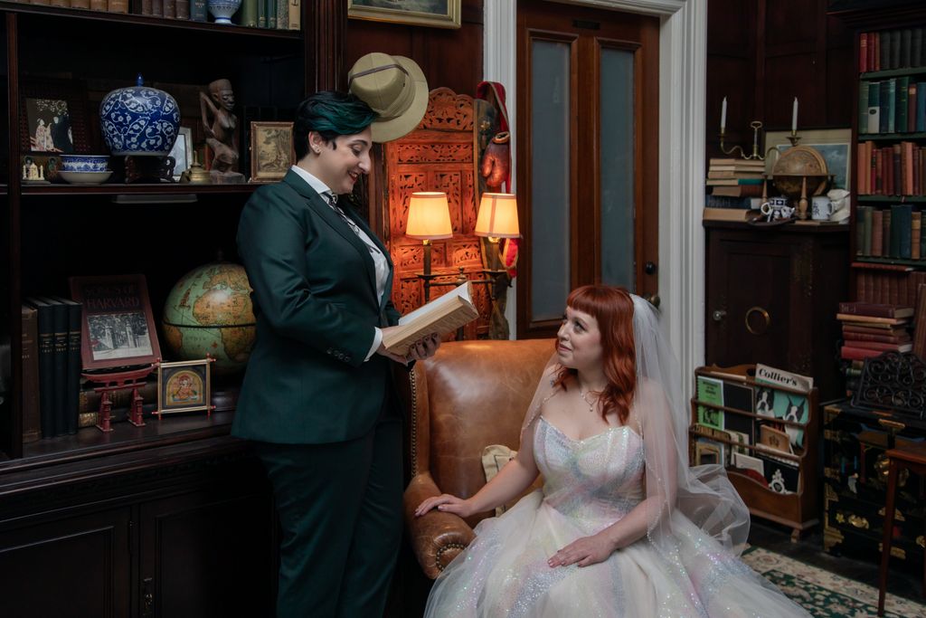 Two brides sit on a brown leather couch surrounded by books and antiques at Diehl Marcus in Salem, MA, before their LGBTQ wedding at The Ledger restaurant, photographed by artistic LGBTQ-friendly wedding photographers Spagnolo Photography.