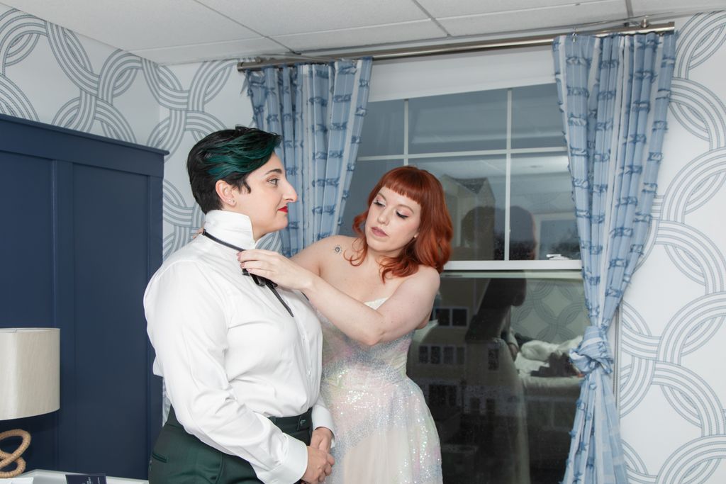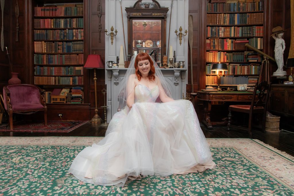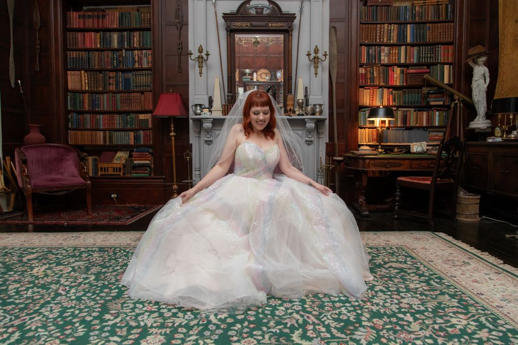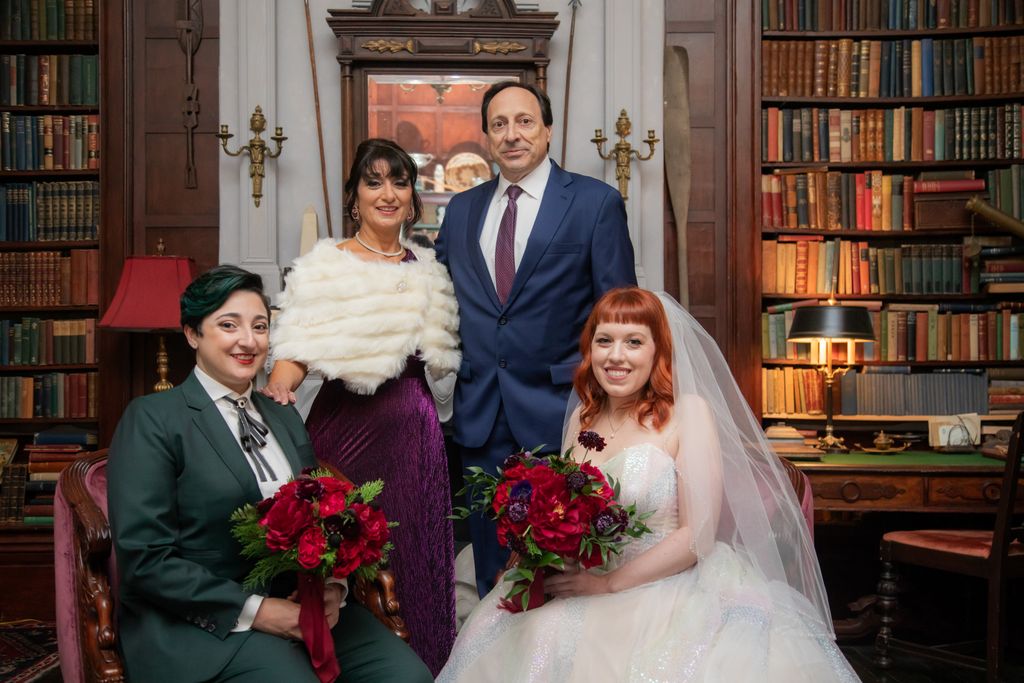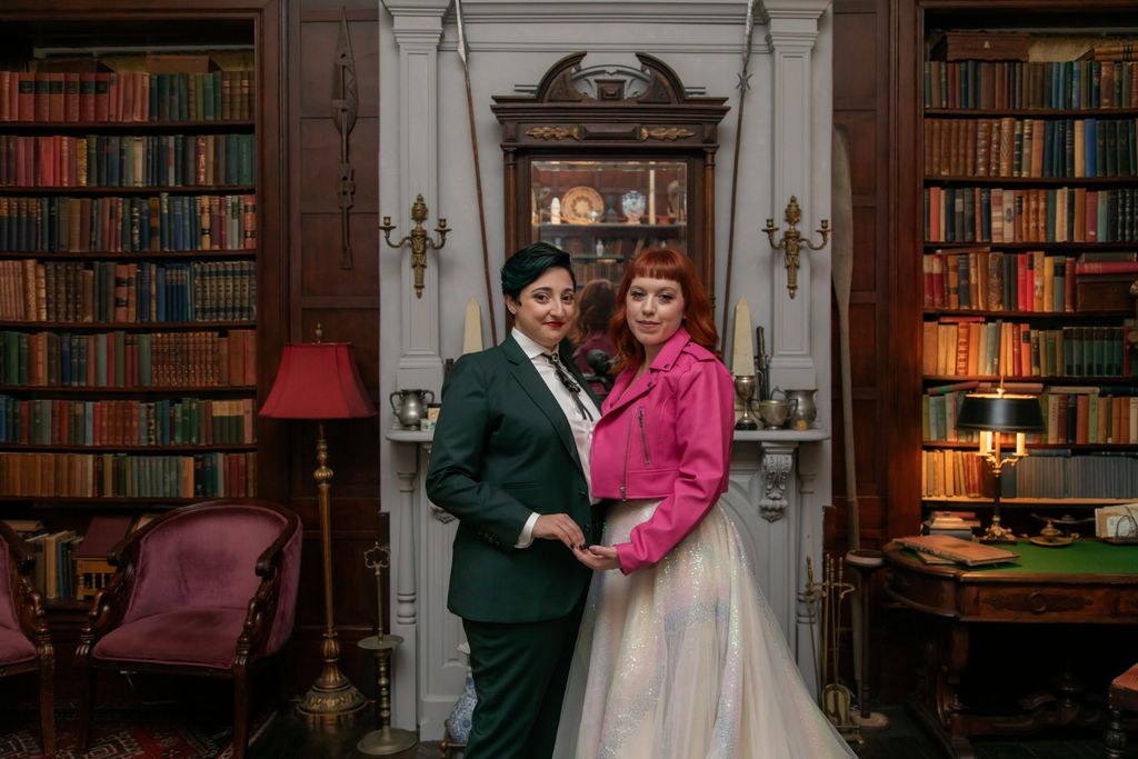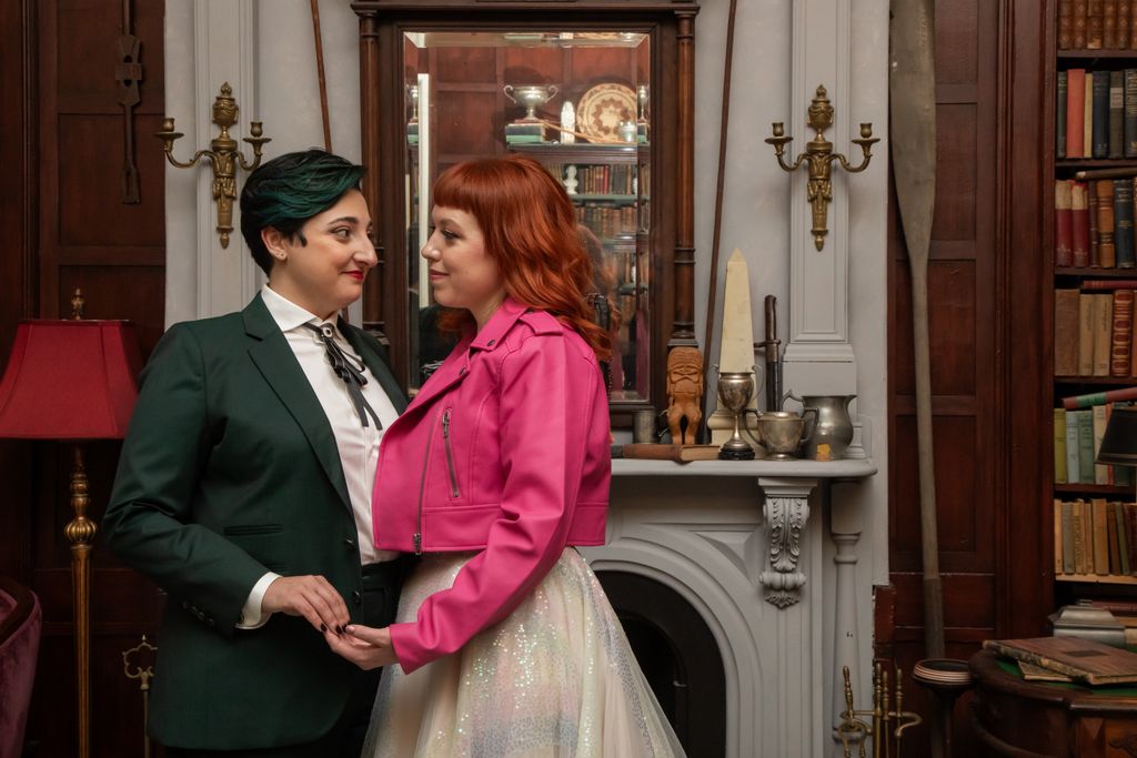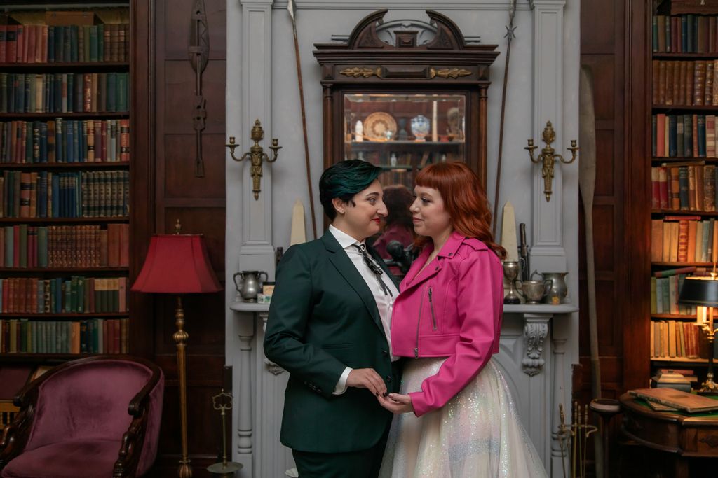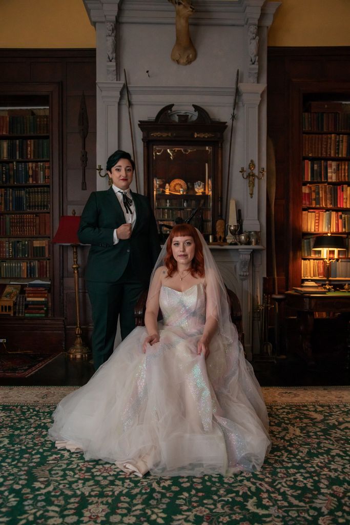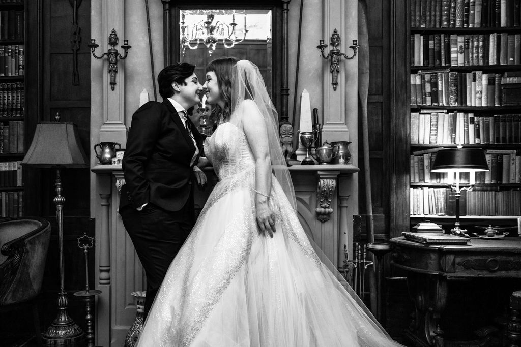 Two brides sit on a brown leather couch surrounded by books and antiques at Diehl Marcus in Salem, MA, before their LGBTQ wedding at The Ledger restaurant, photographed by artistic LGBTQ-friendly wedding photographers Spagnolo Photography.