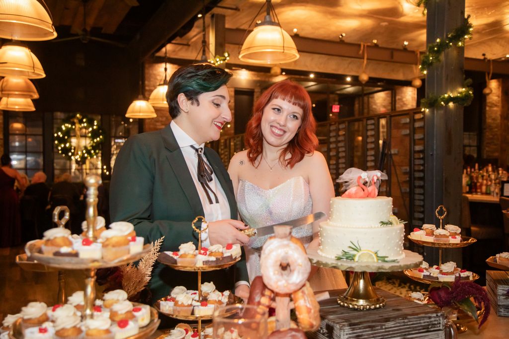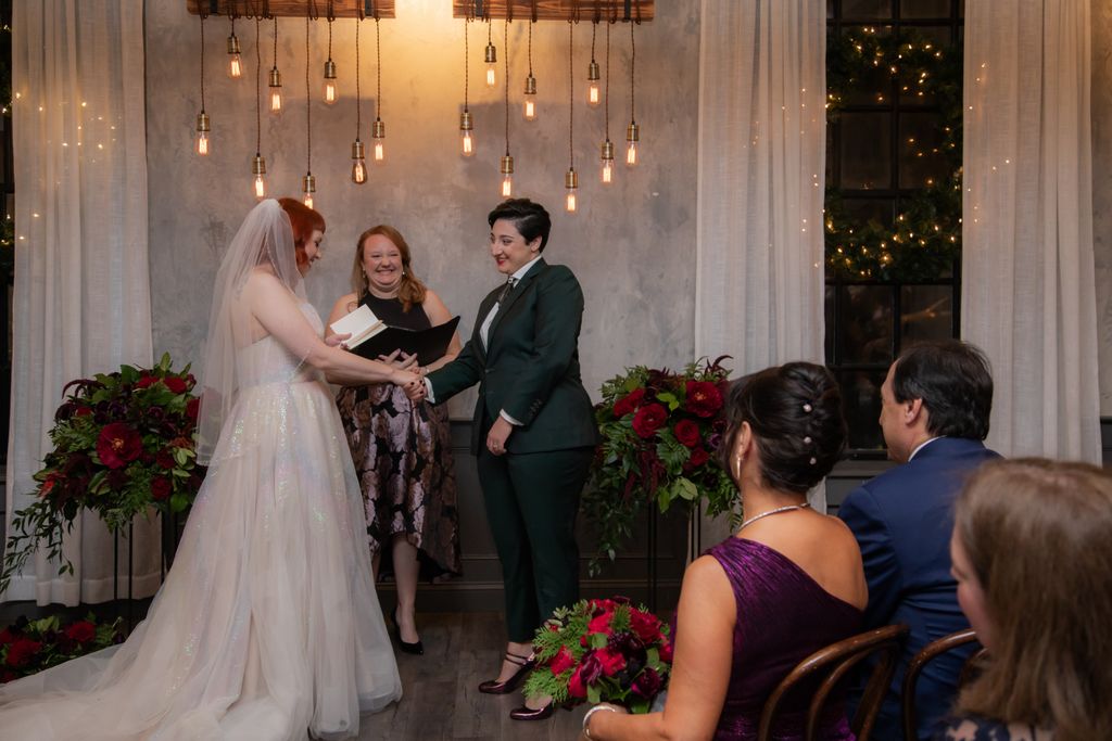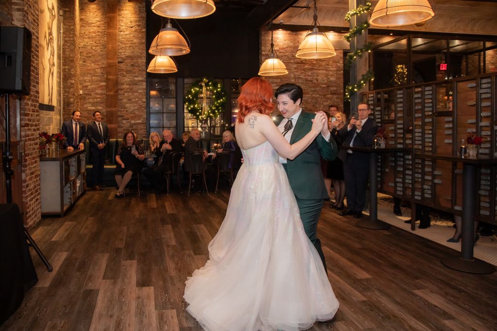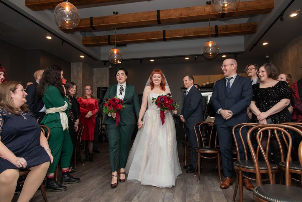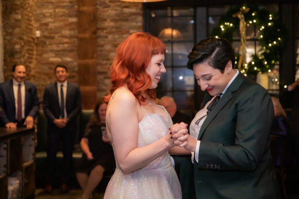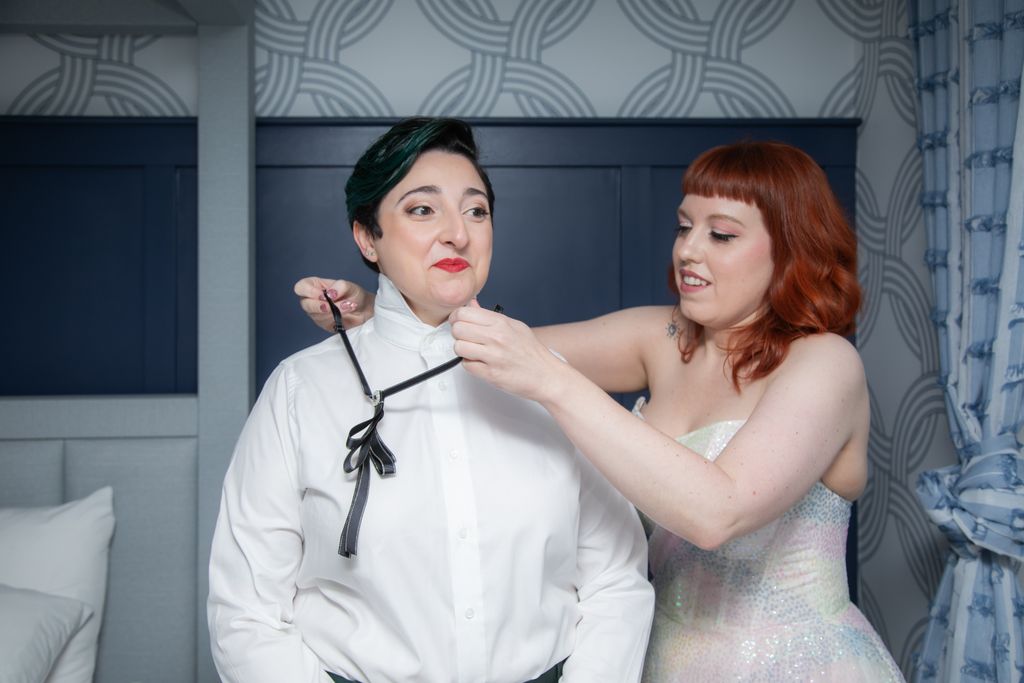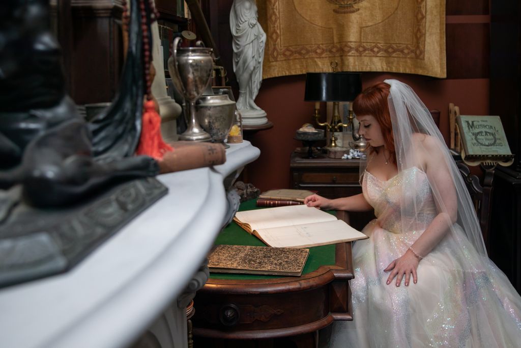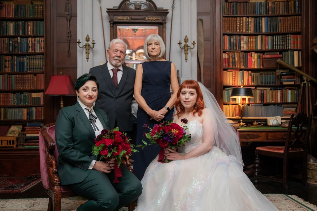 Two brides sit on a brown leather couch surrounded by books and antiques at Diehl Marcus in Salem, MA, before their LGBTQ wedding at The Ledger restaurant, photographed by artistic LGBTQ-friendly wedding photographers Spagnolo Photography.