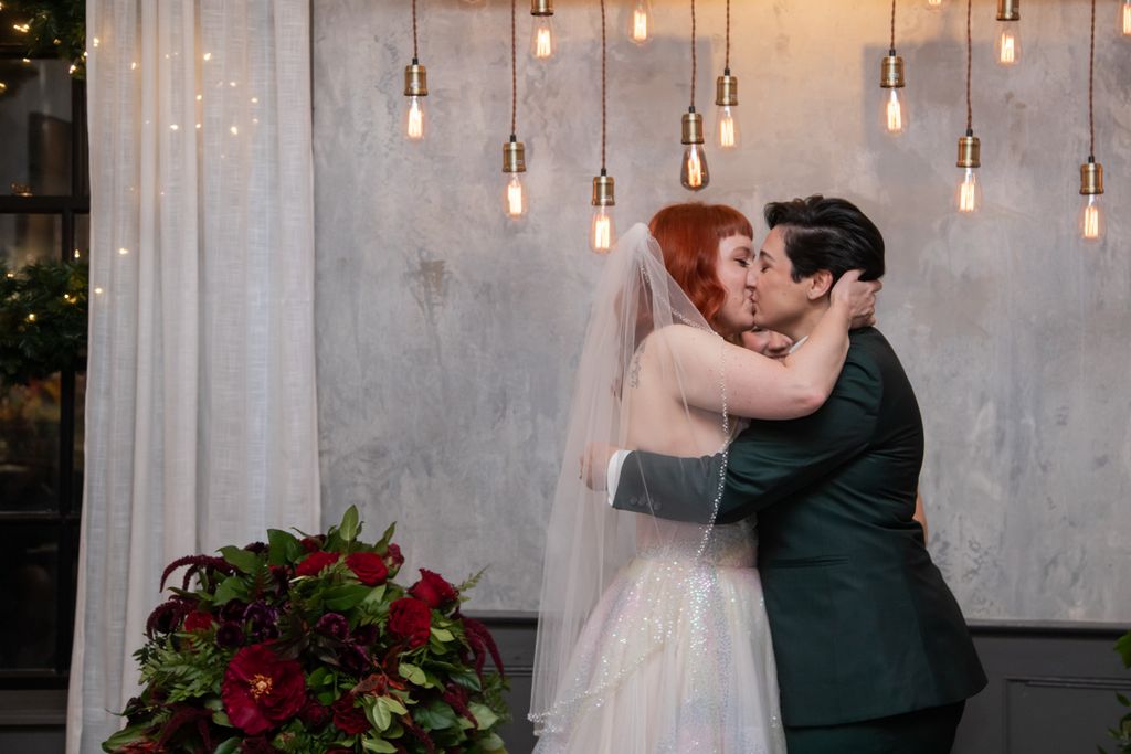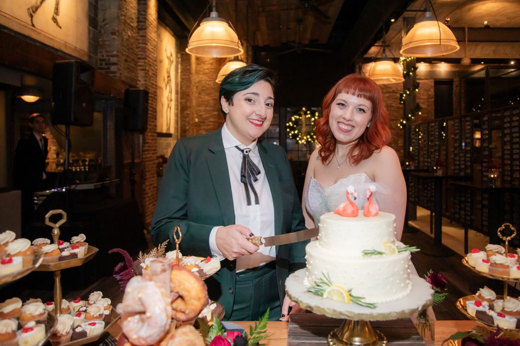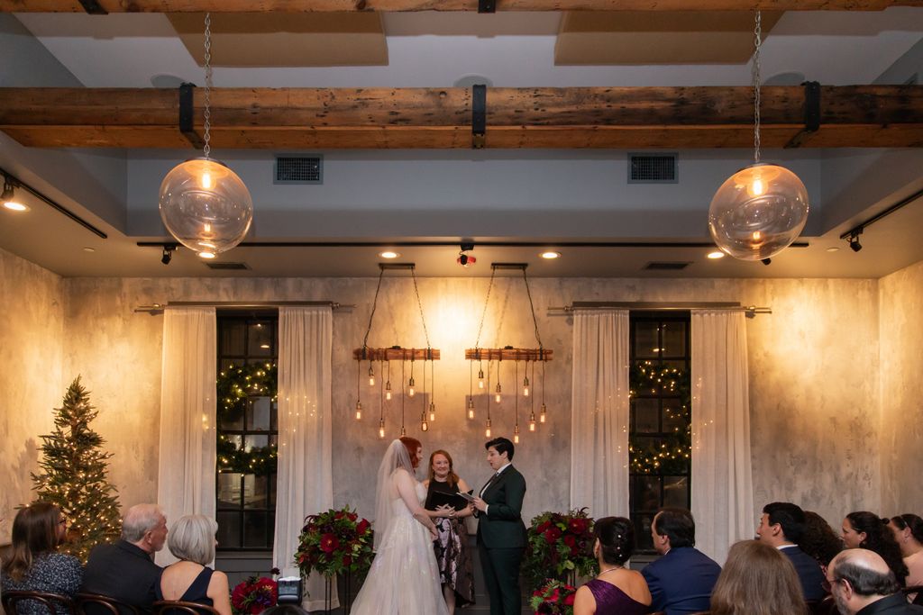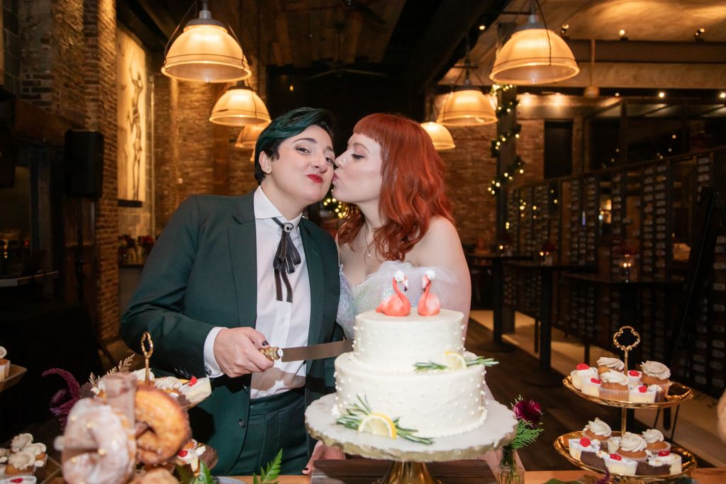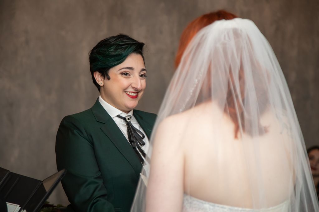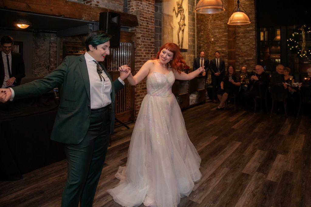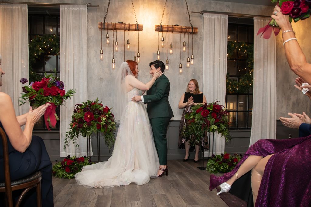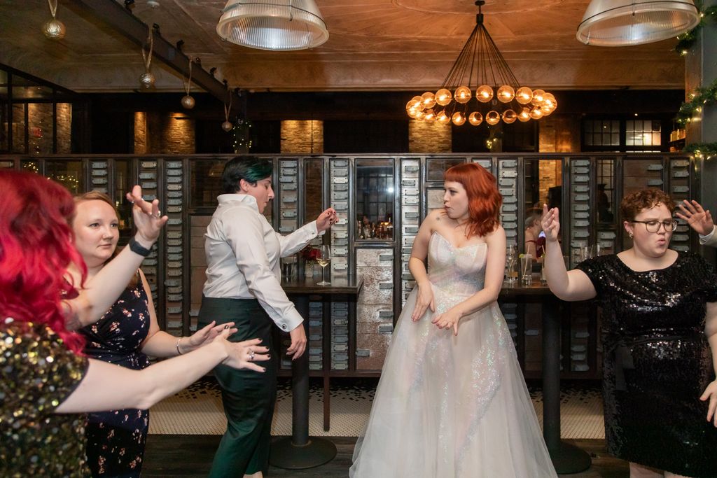 Two brides sit on a brown leather couch surrounded by books and antiques at Diehl Marcus in Salem, MA, before their LGBTQ wedding at The Ledger restaurant, photographed by artistic LGBTQ-friendly wedding photographers Spagnolo Photography.
