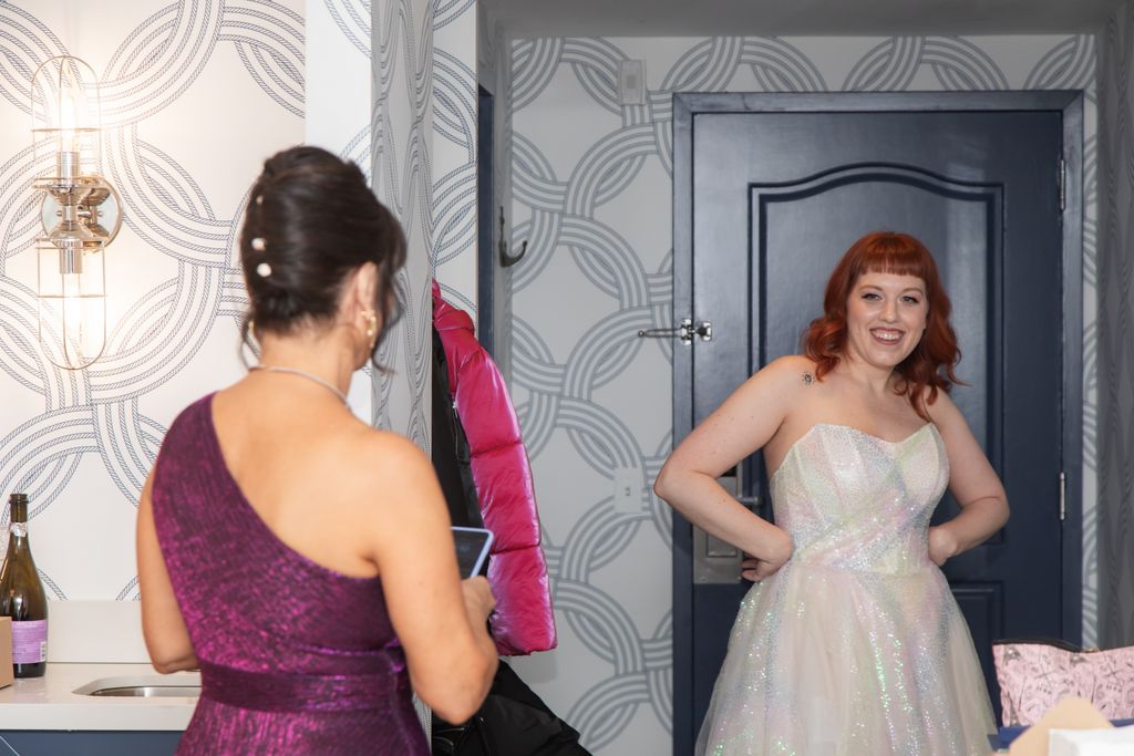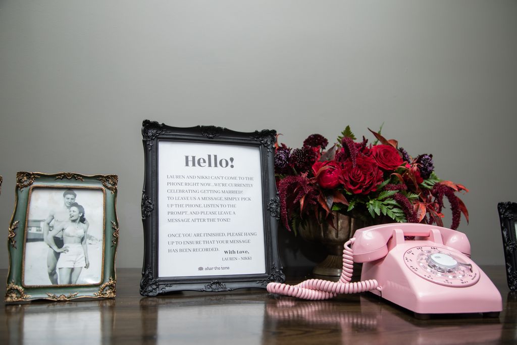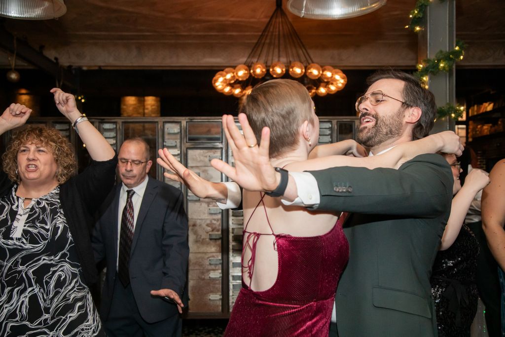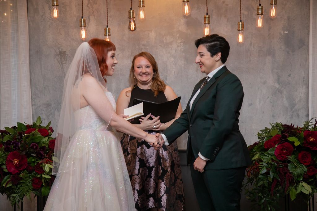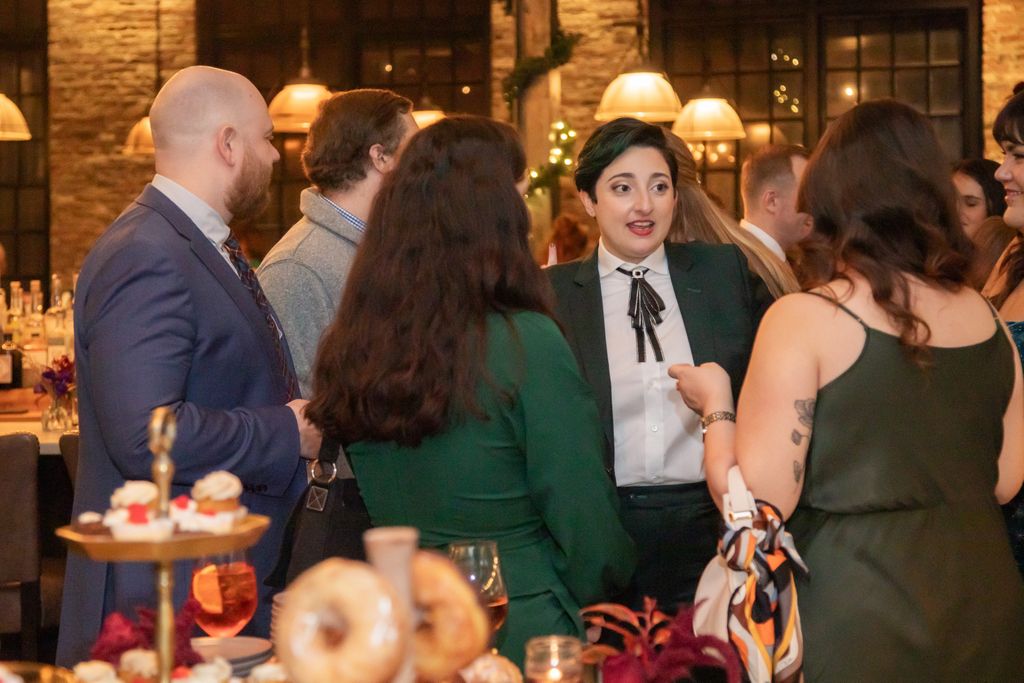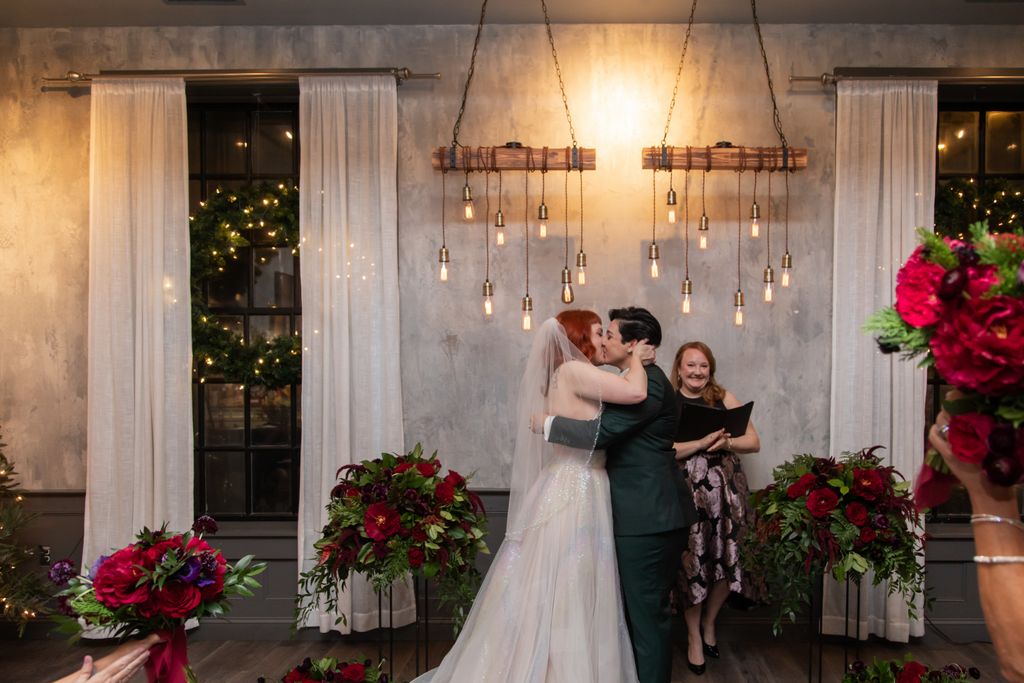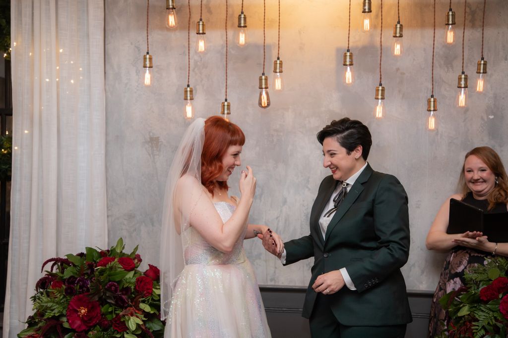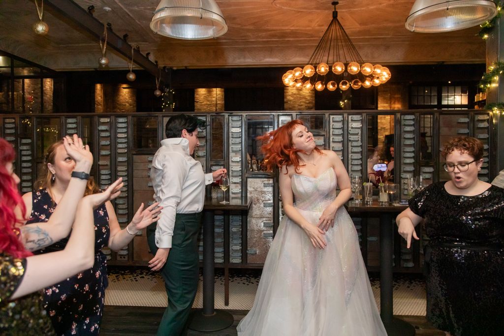 Two brides sit on a brown leather couch surrounded by books and antiques at Diehl Marcus in Salem, MA, before their LGBTQ wedding at The Ledger restaurant, photographed by artistic LGBTQ-friendly wedding photographers Spagnolo Photography.