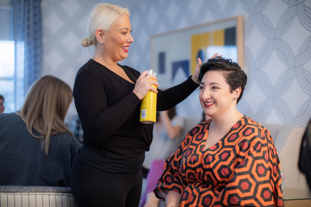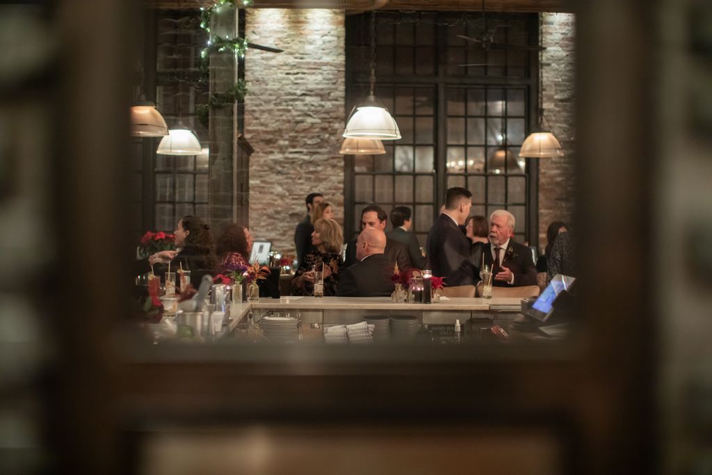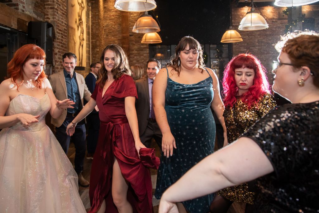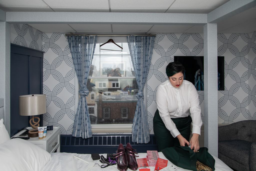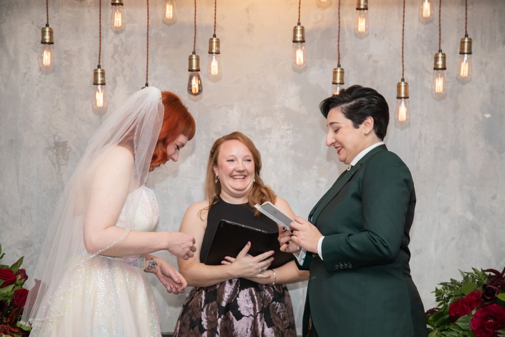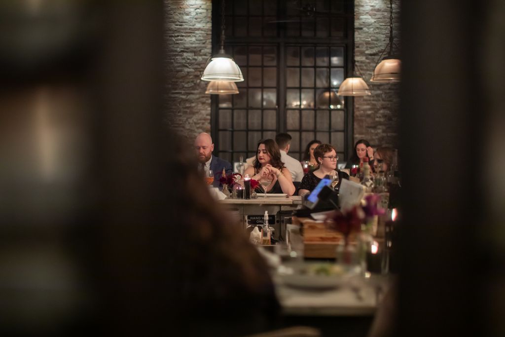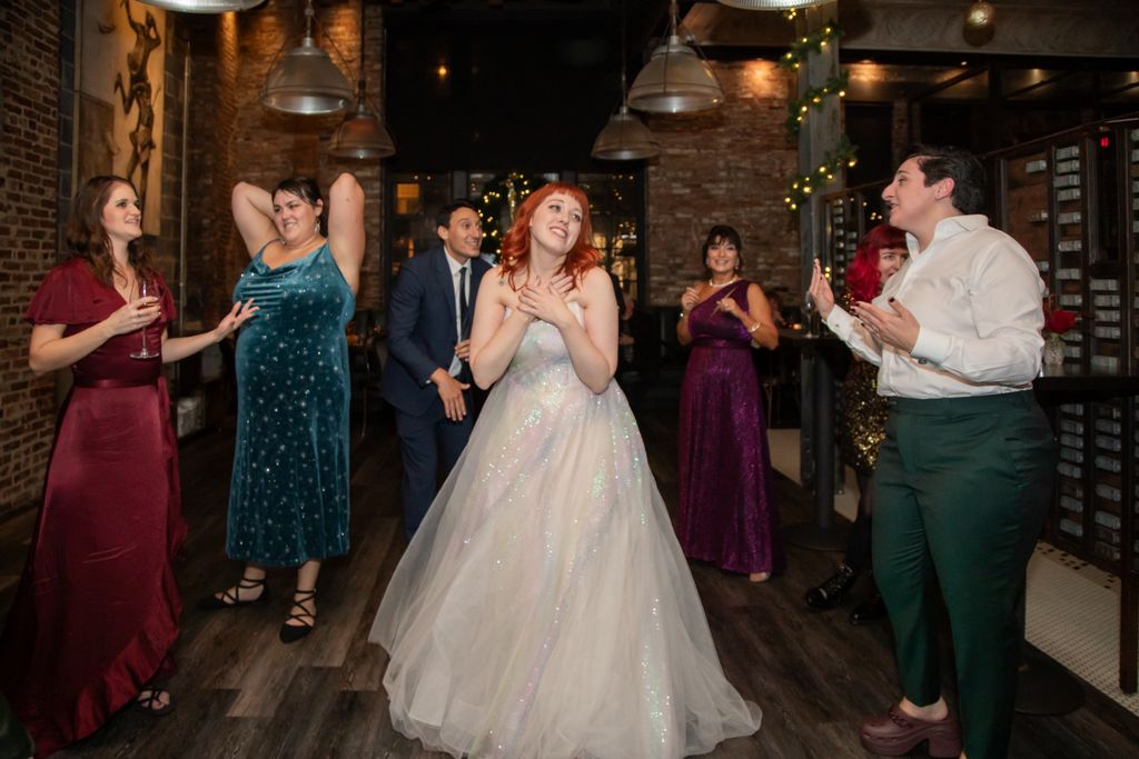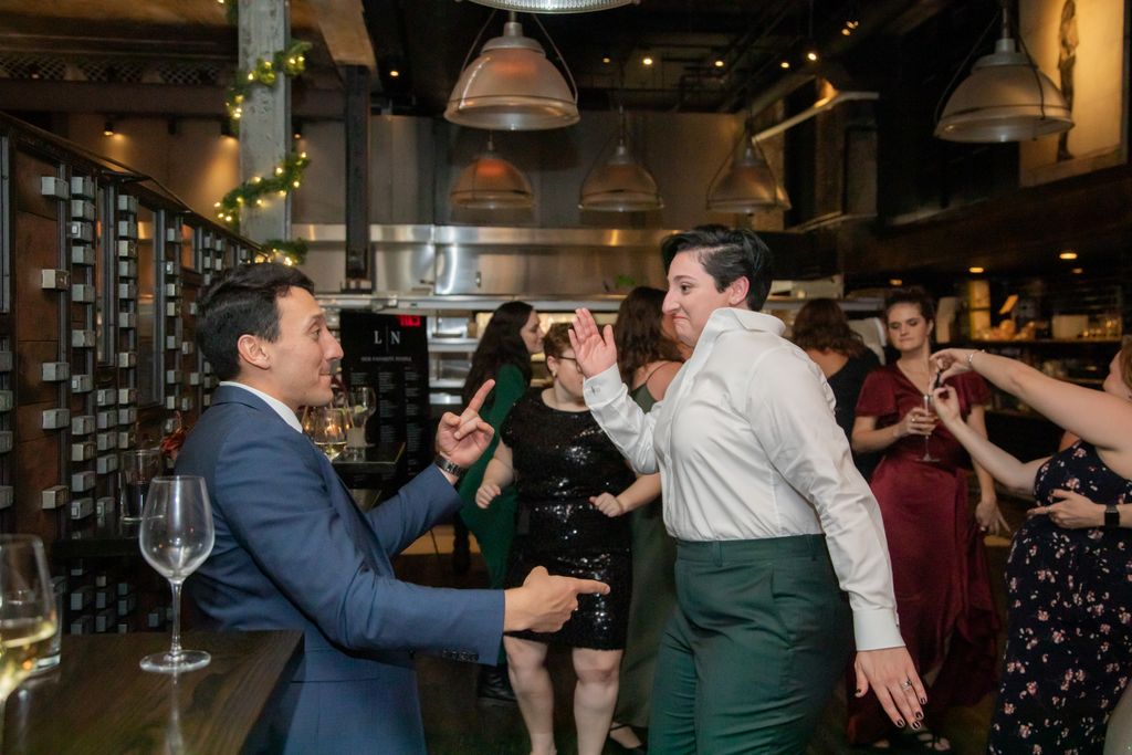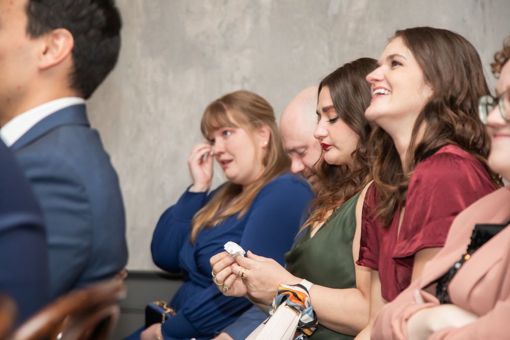 Two brides sit on a brown leather couch surrounded by books and antiques at Diehl Marcus in Salem, MA, before their LGBTQ wedding at The Ledger restaurant, photographed by artistic LGBTQ-friendly wedding photographers Spagnolo Photography.