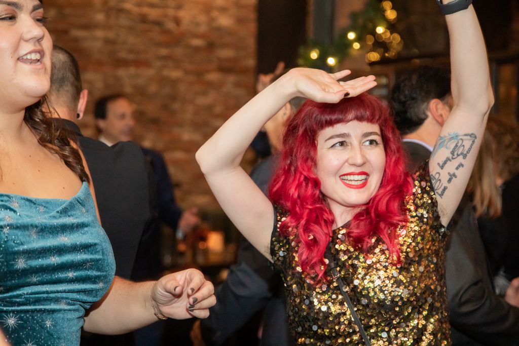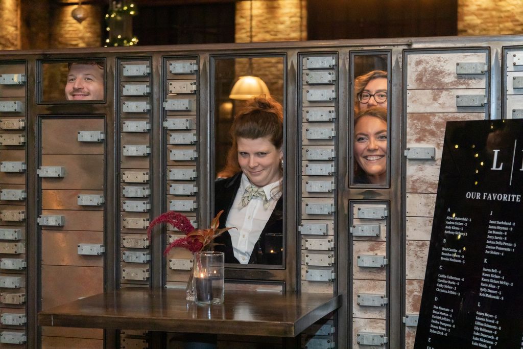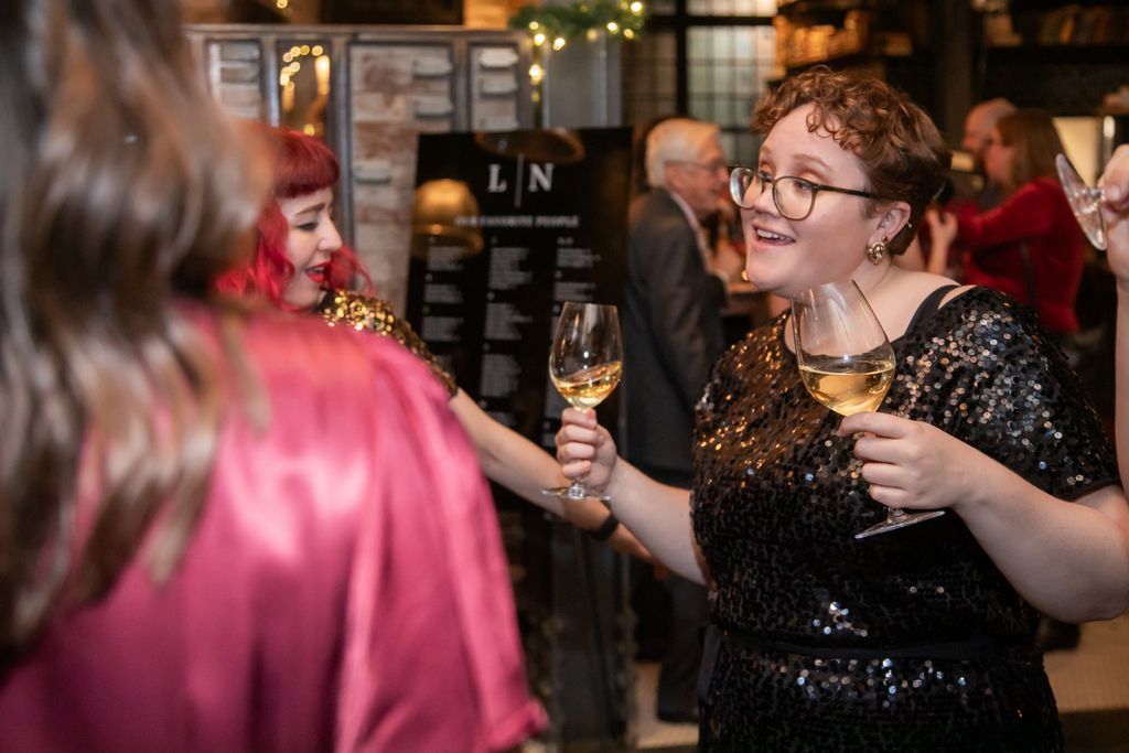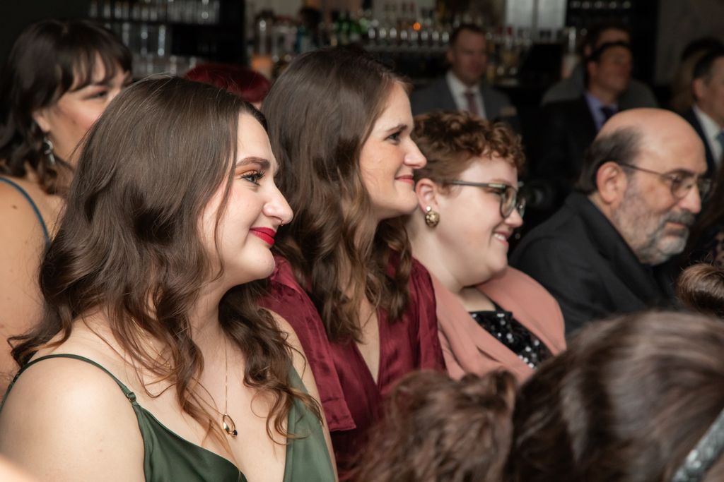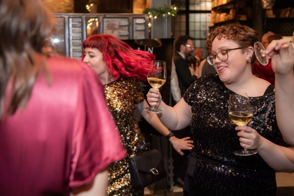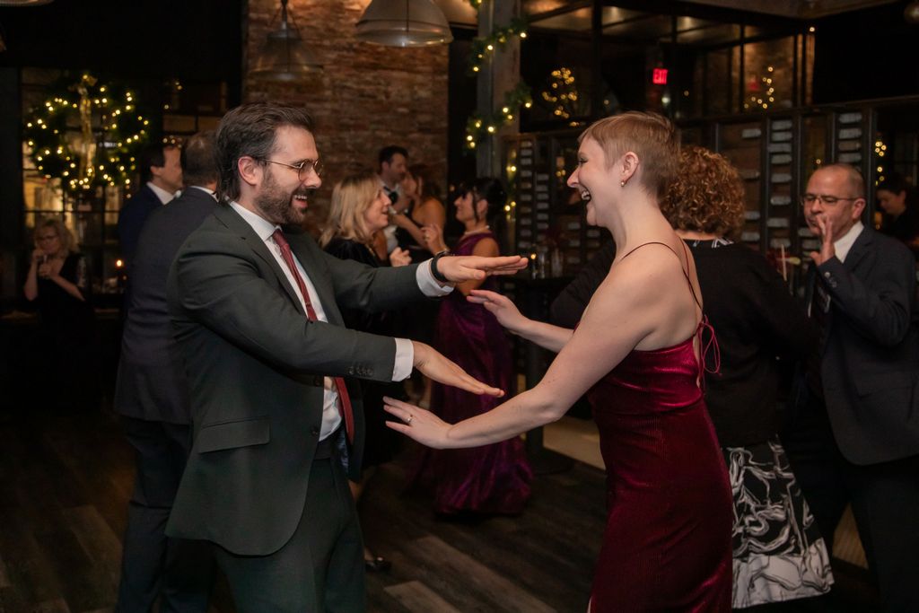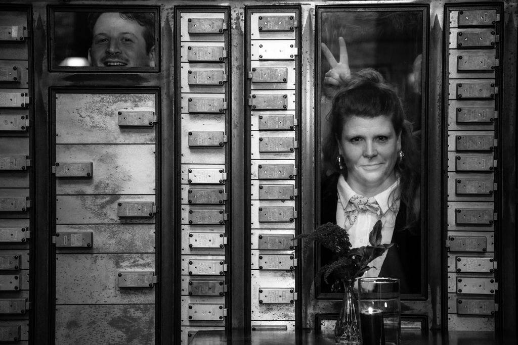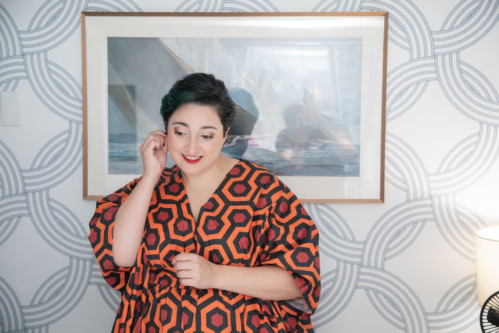 Two brides sit on a brown leather couch surrounded by books and antiques at Diehl Marcus in Salem, MA, before their LGBTQ wedding at The Ledger restaurant, photographed by artistic LGBTQ-friendly wedding photographers Spagnolo Photography.